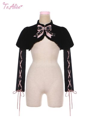 たっぷりリボンがあしらわれたピンクのジャカード生地とブラックのベロア生地の切り替えコルセット風ドレス。