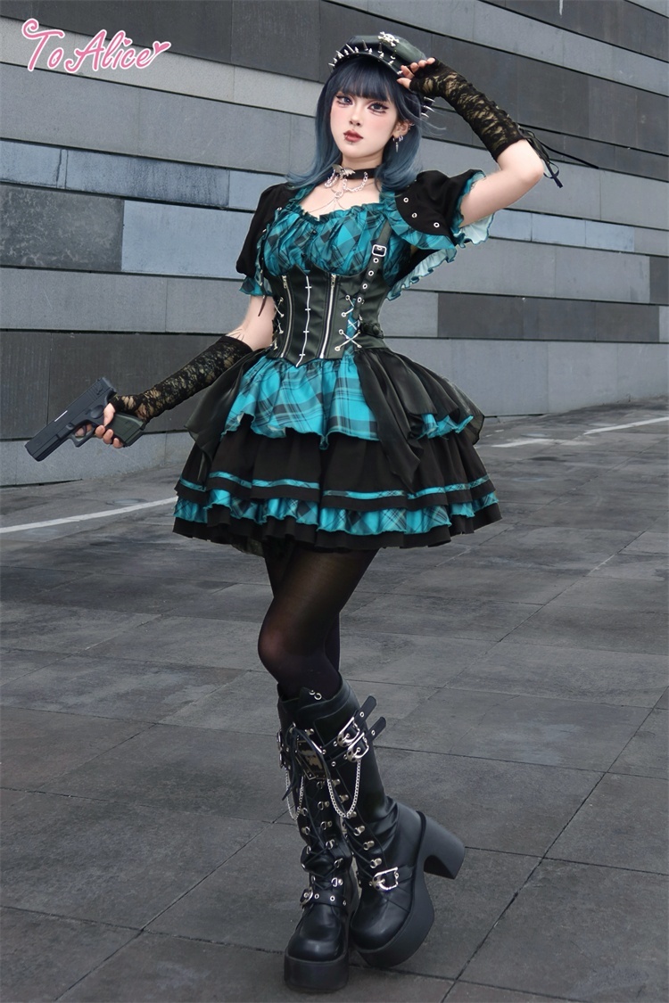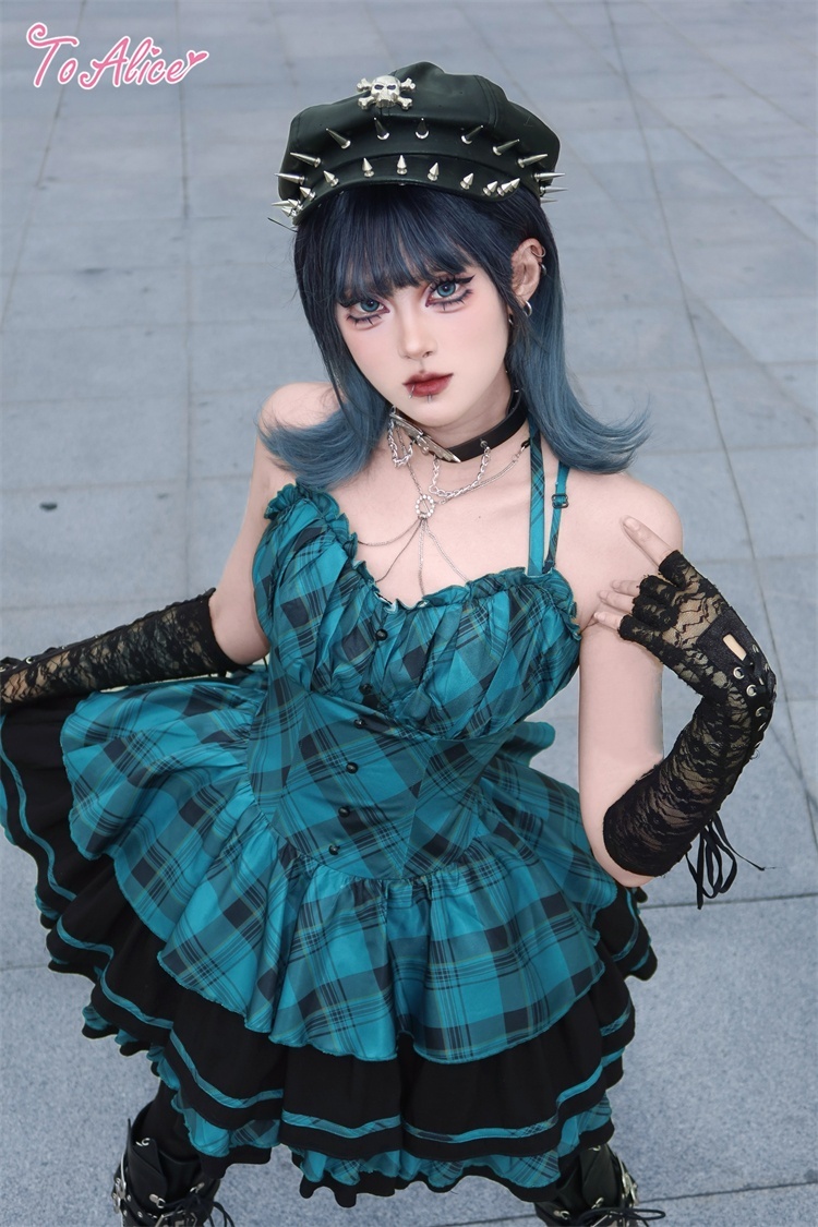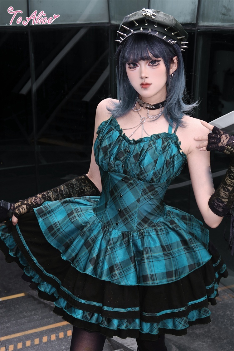 簡易パニエ付きタータンチェックティアードジャンパースカート。胸元のチェーンは取り外し可能。