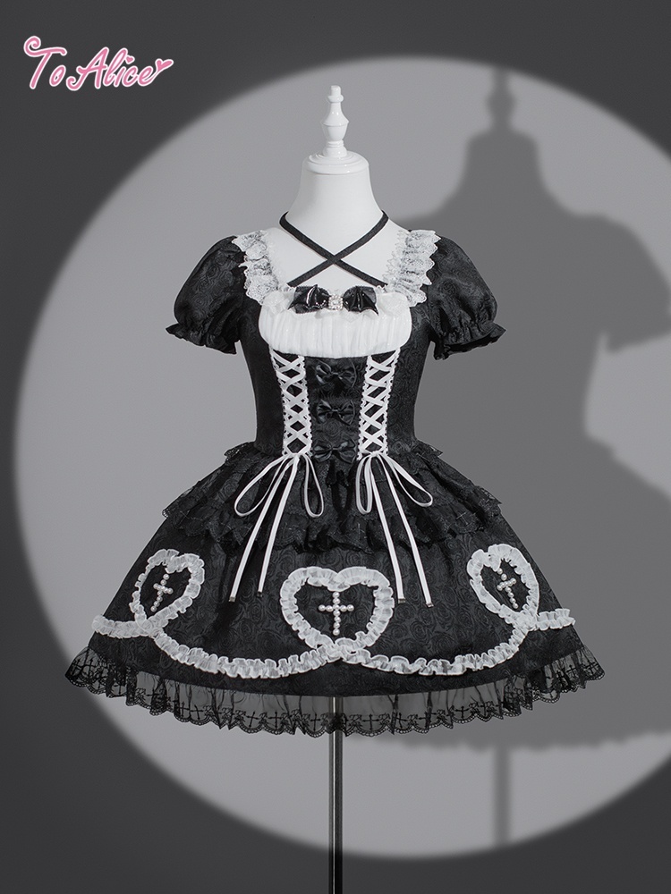 十字架とハートフリルがあしわられたワンピース。