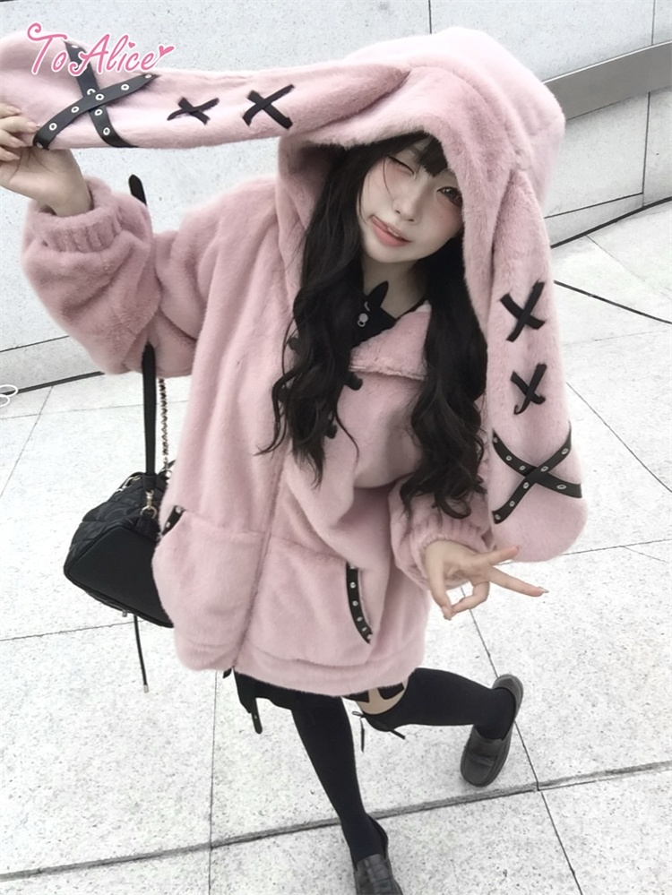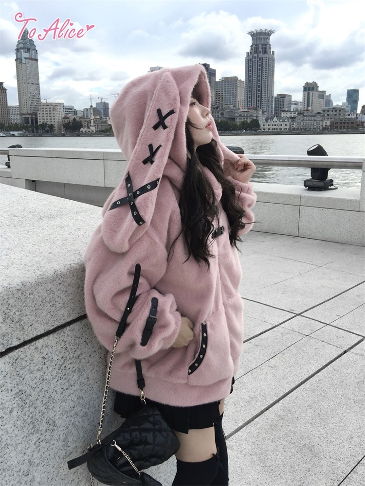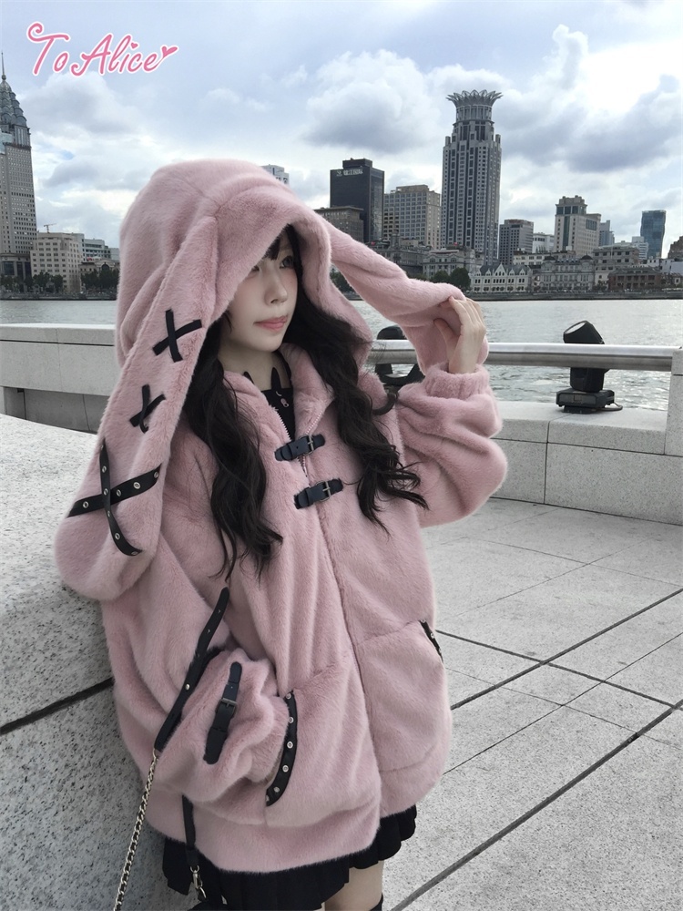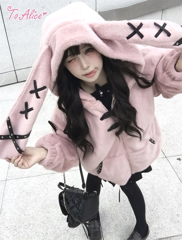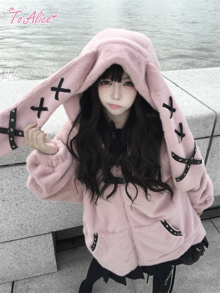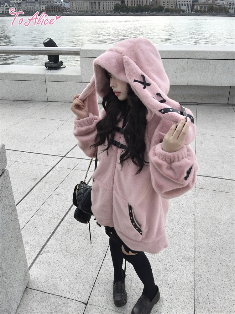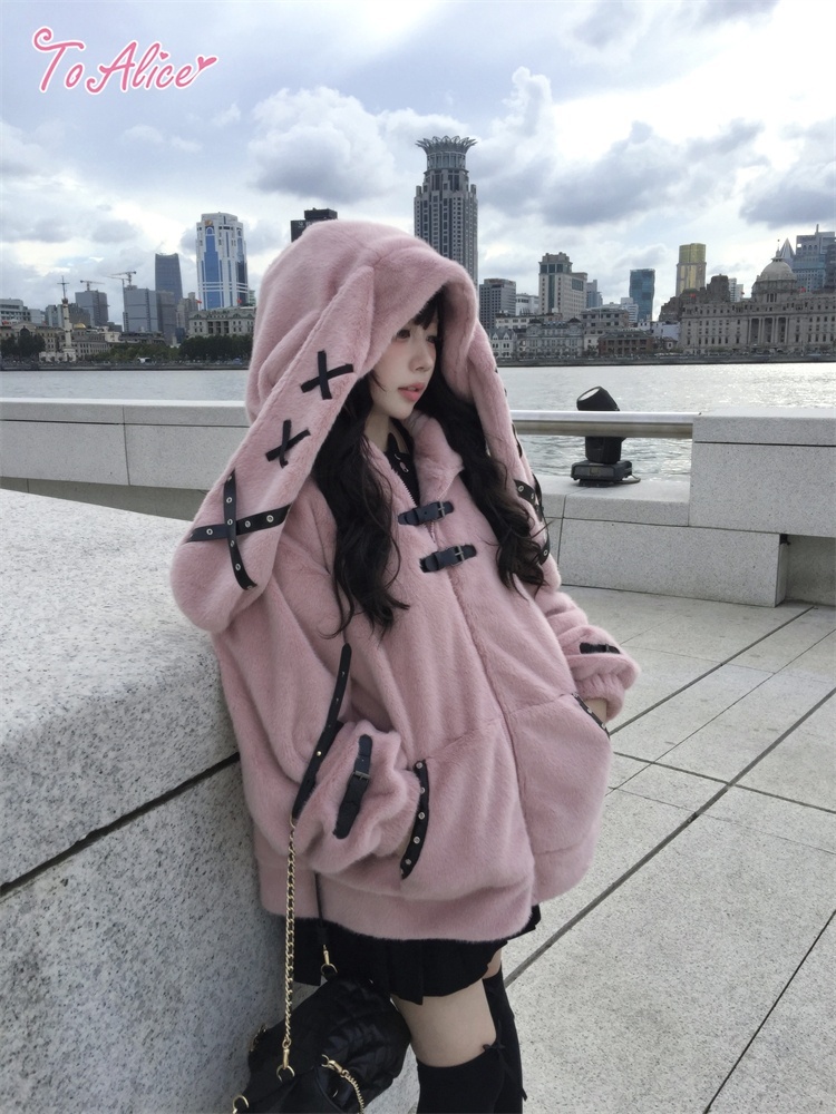 【Black Shamrock】F247 レザーリボンもこもこうさ耳パーカー [F247]