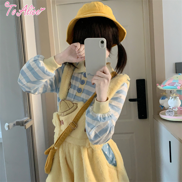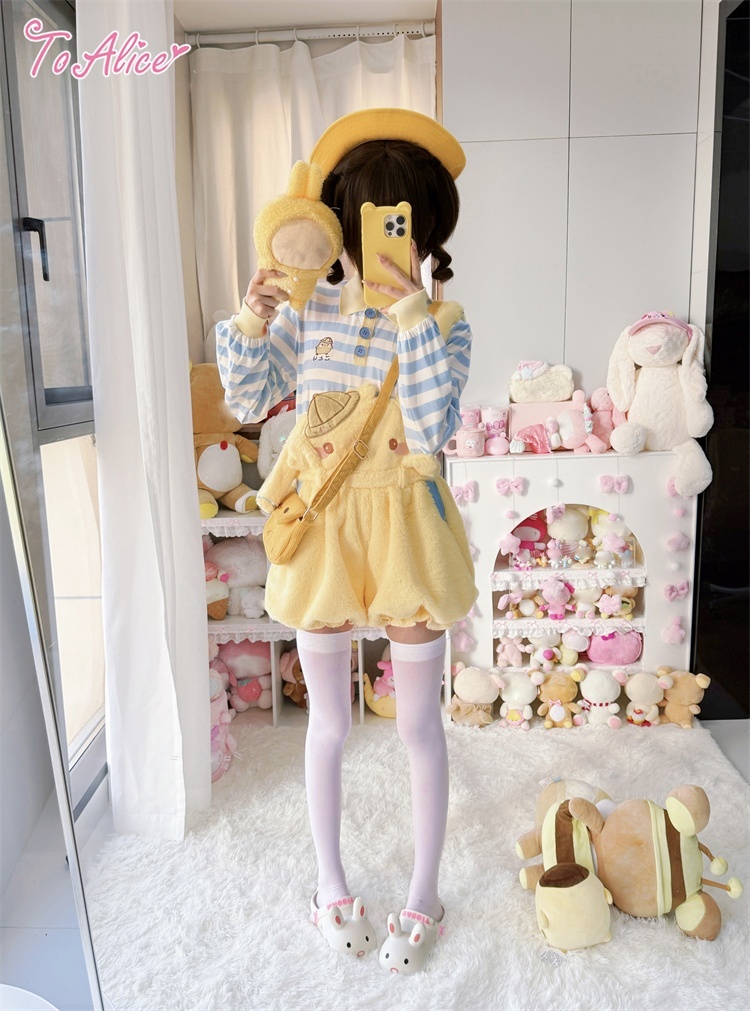 園児帽をかぶったことりモチーフのもこもこバルーンサロペットパンツ。