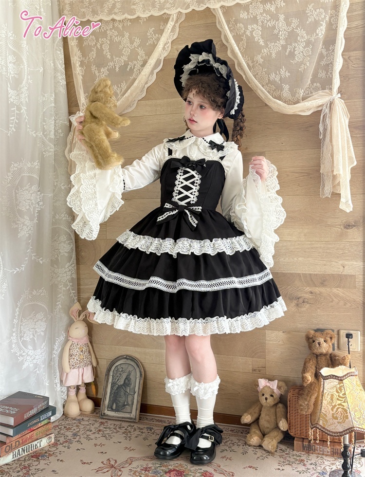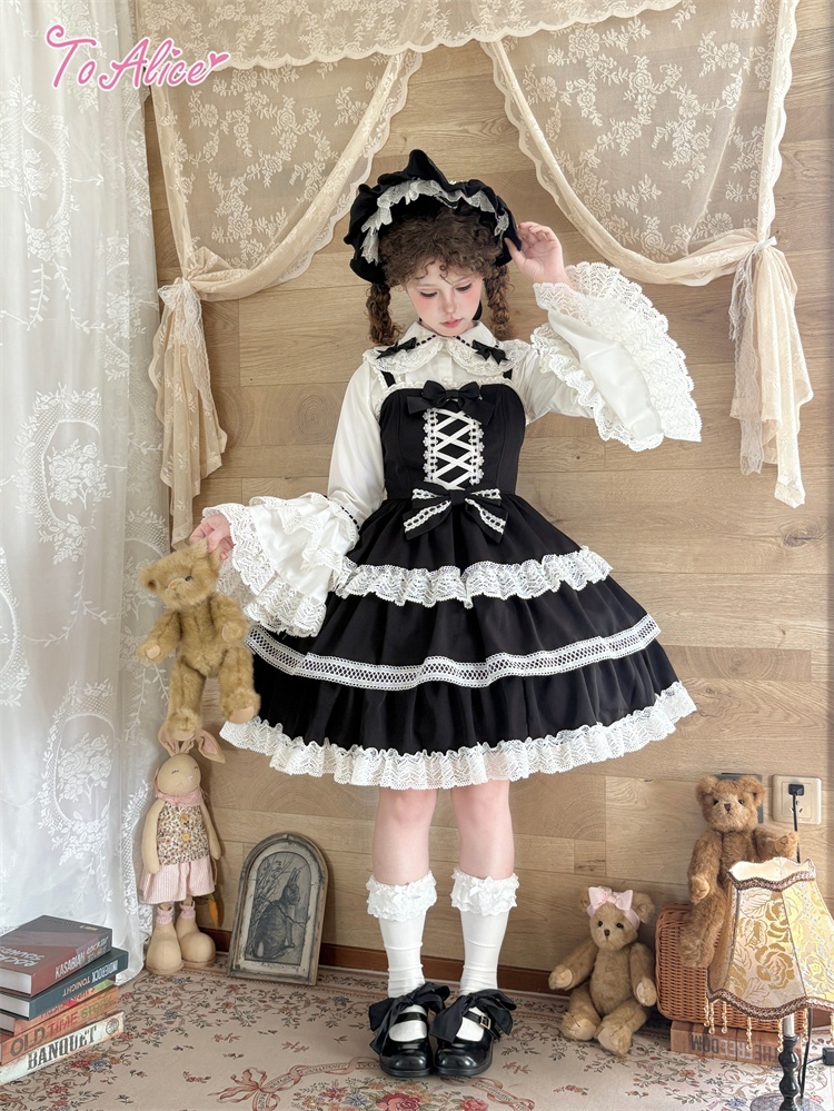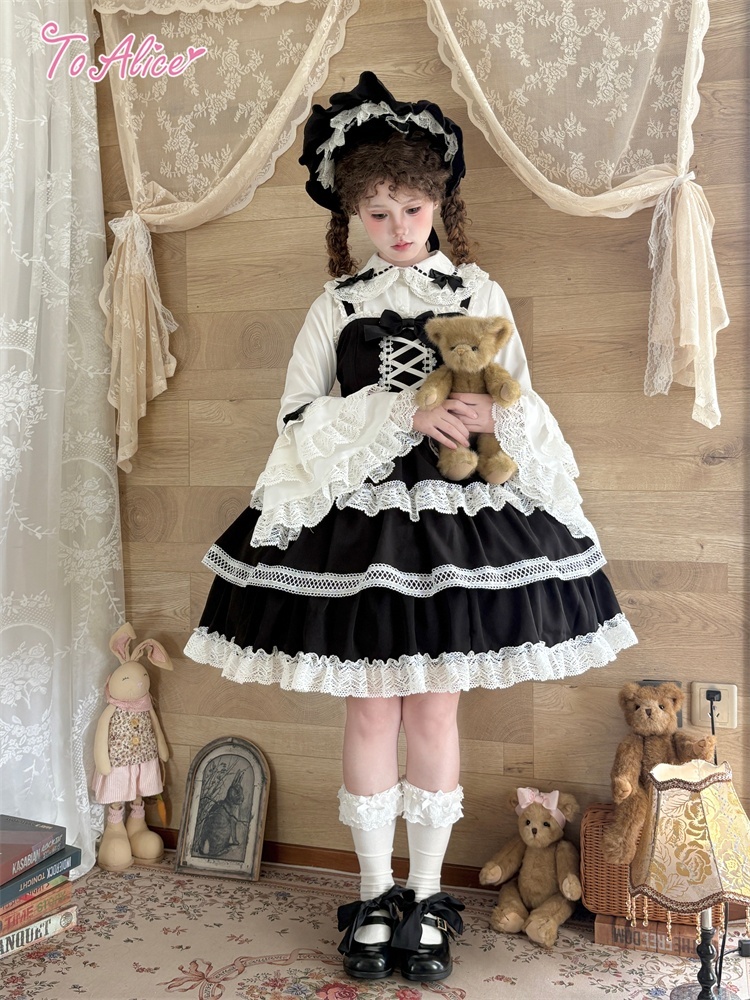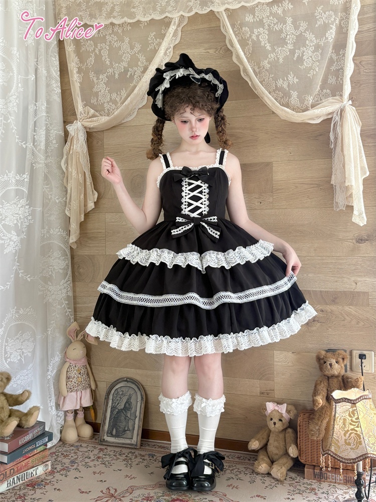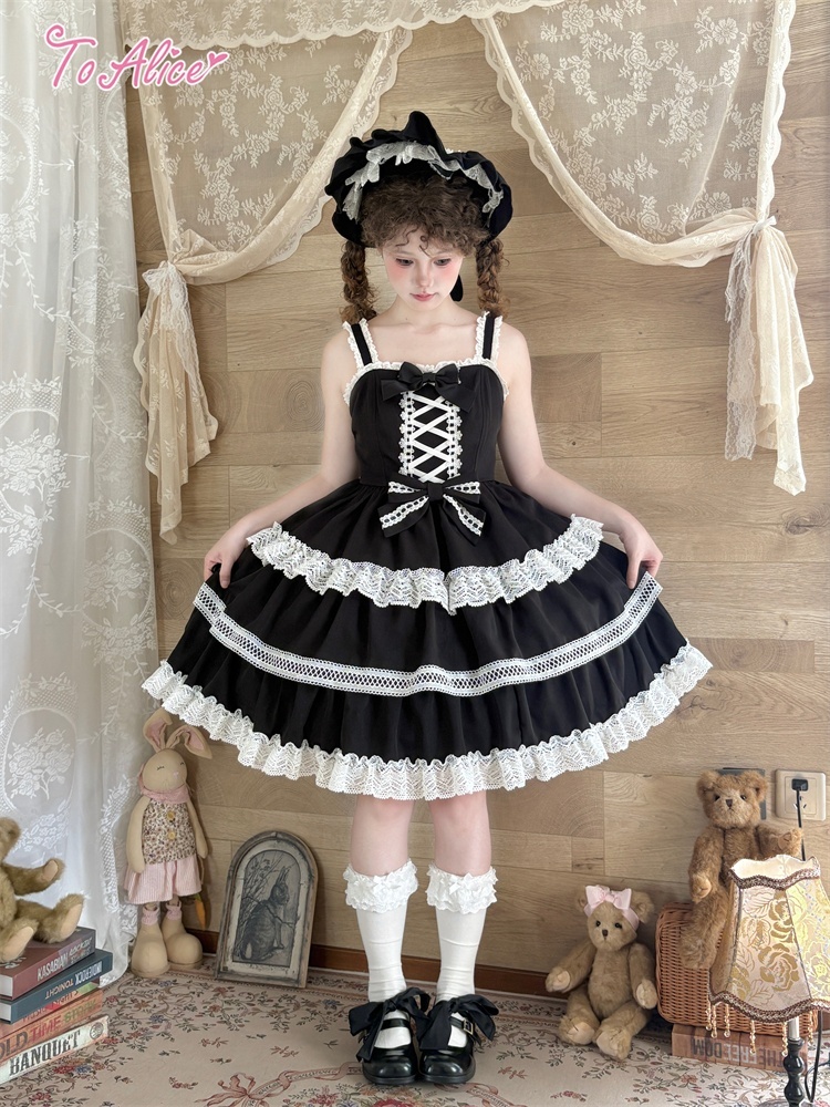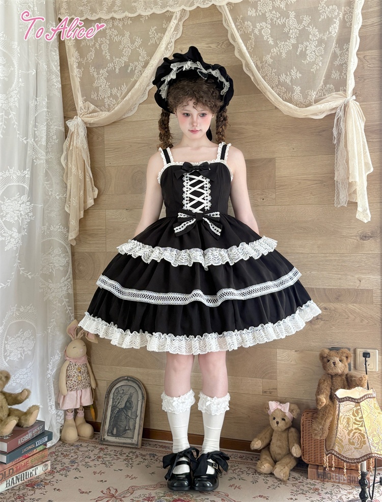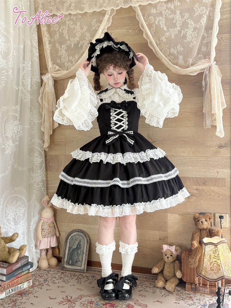 たっぷりのコットンレースとレースアップデザインが可愛いドーリーなジャンパースカート。