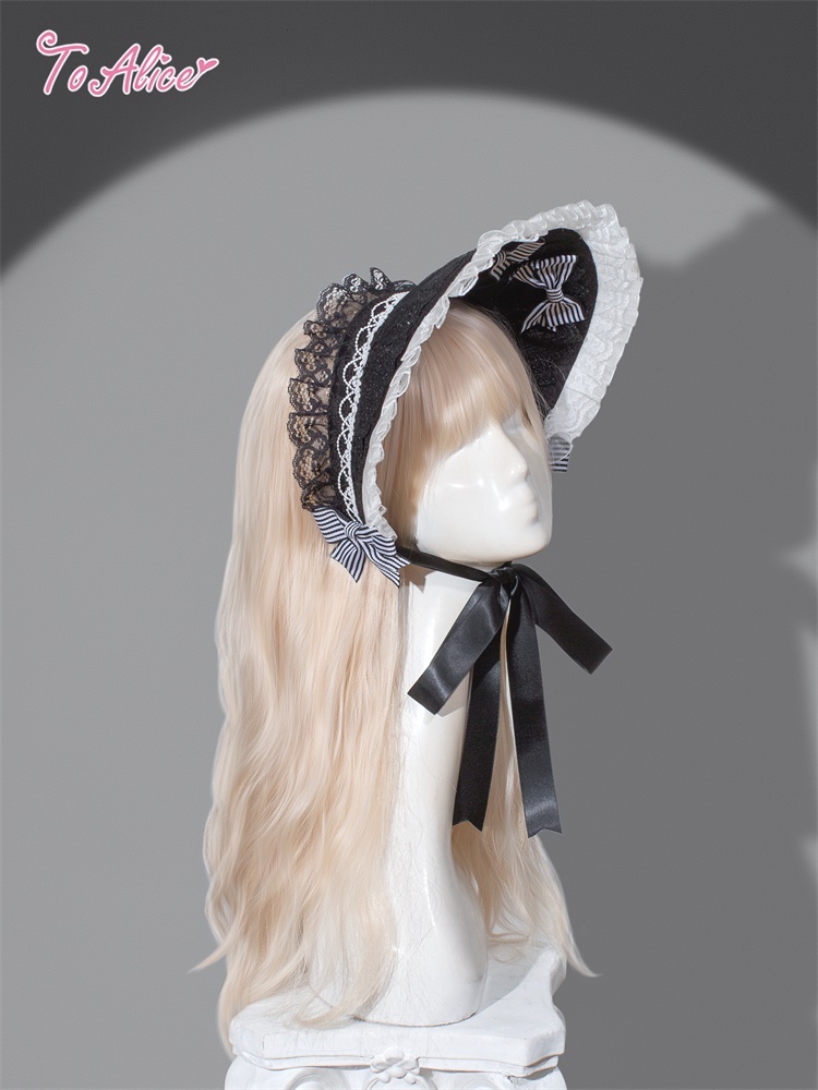 ストライプリボンがサイドに付いたボンネット。