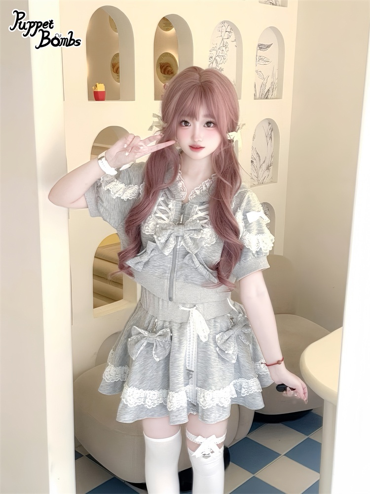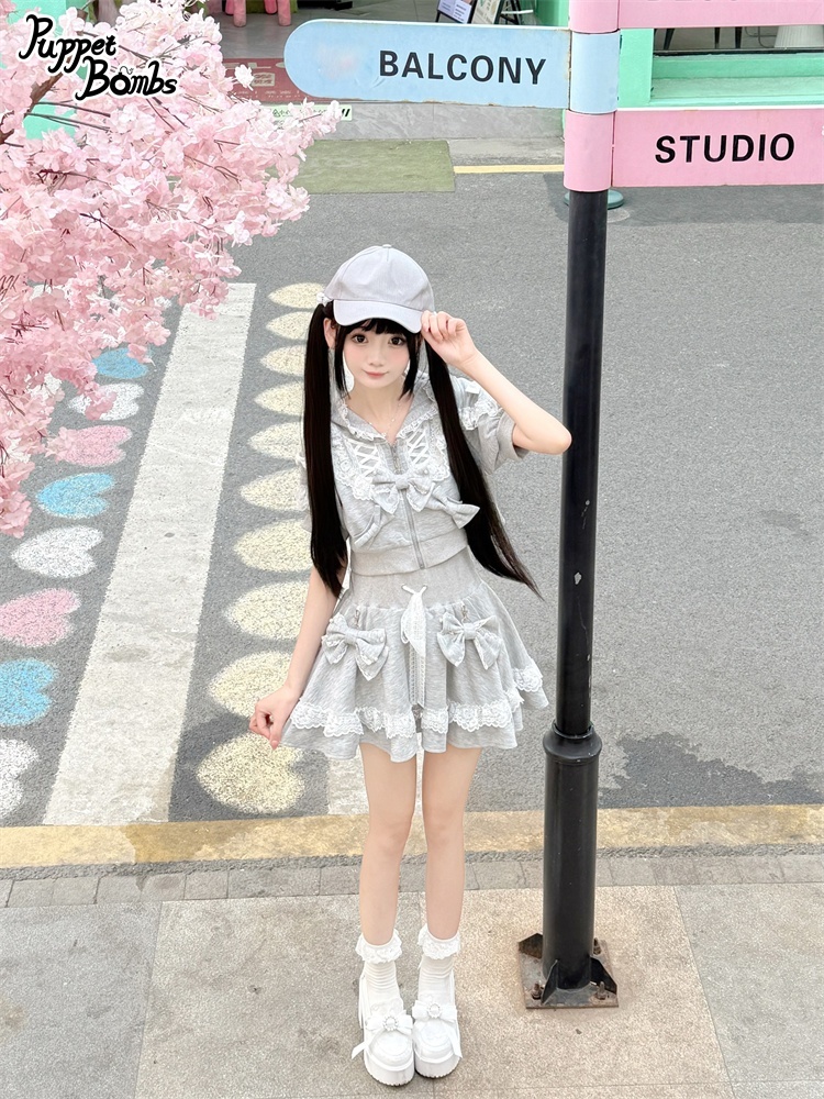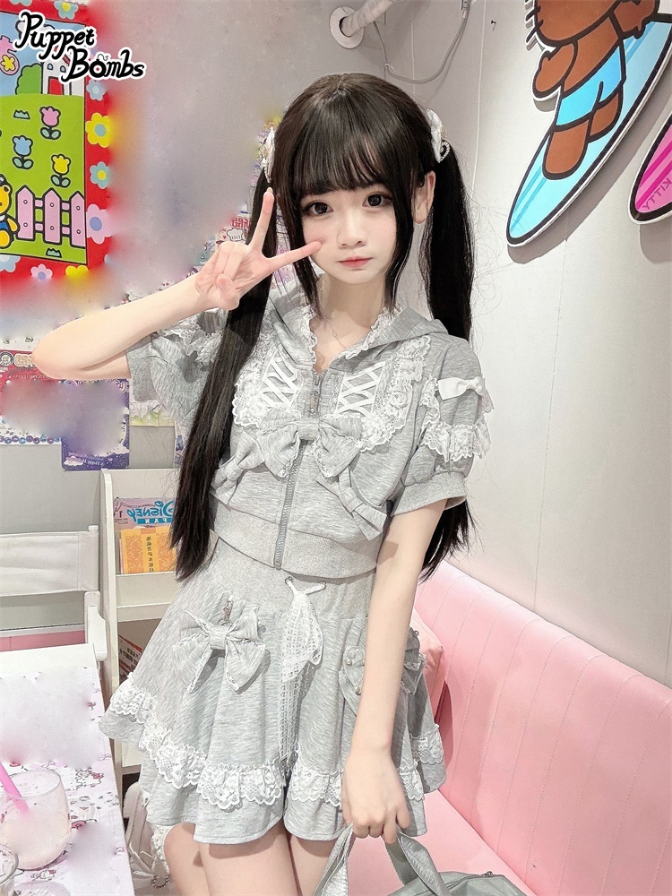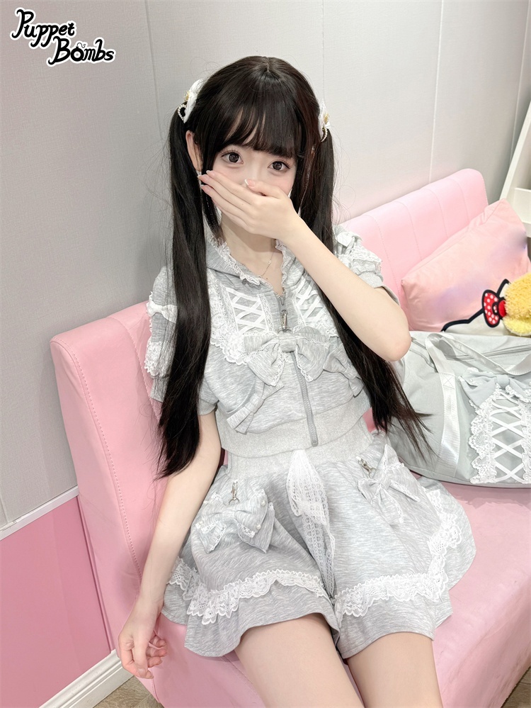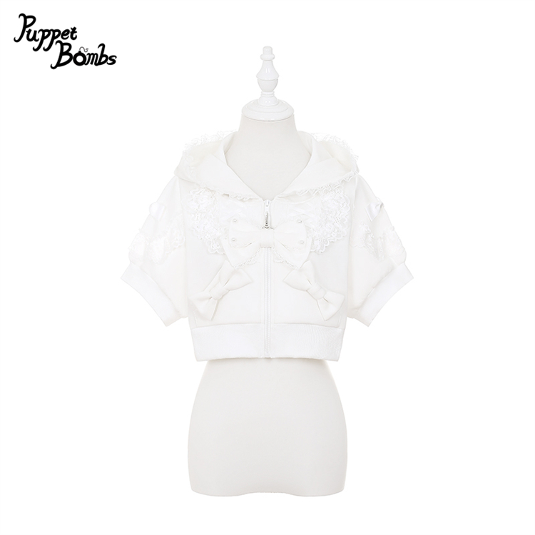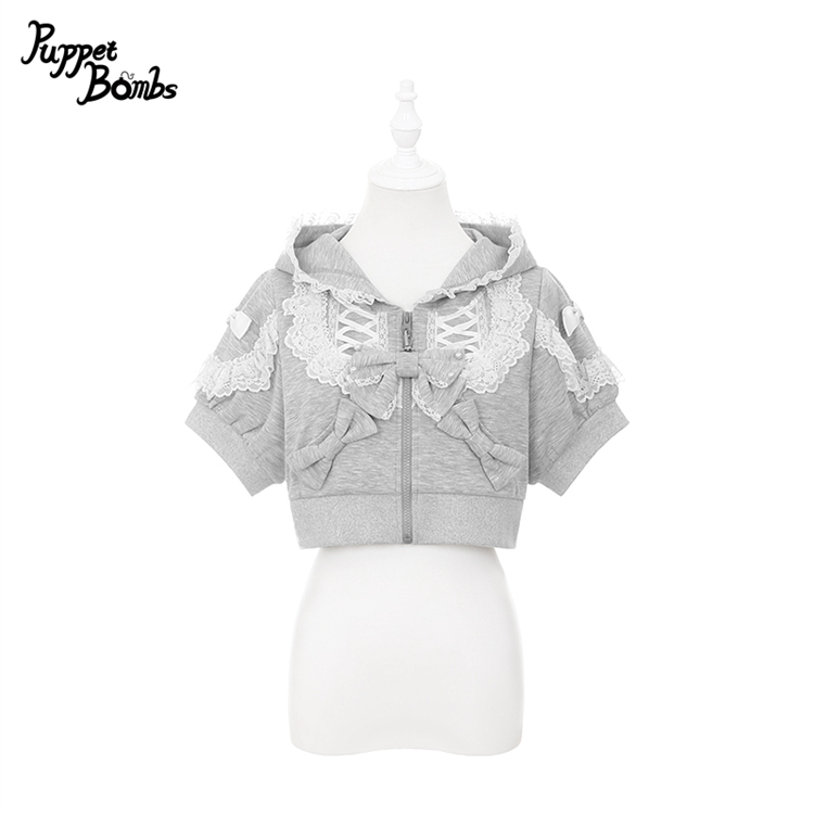 【PuppetBombs】Q461 リボンデコレーションレースアップ半袖パーカー [Q461]