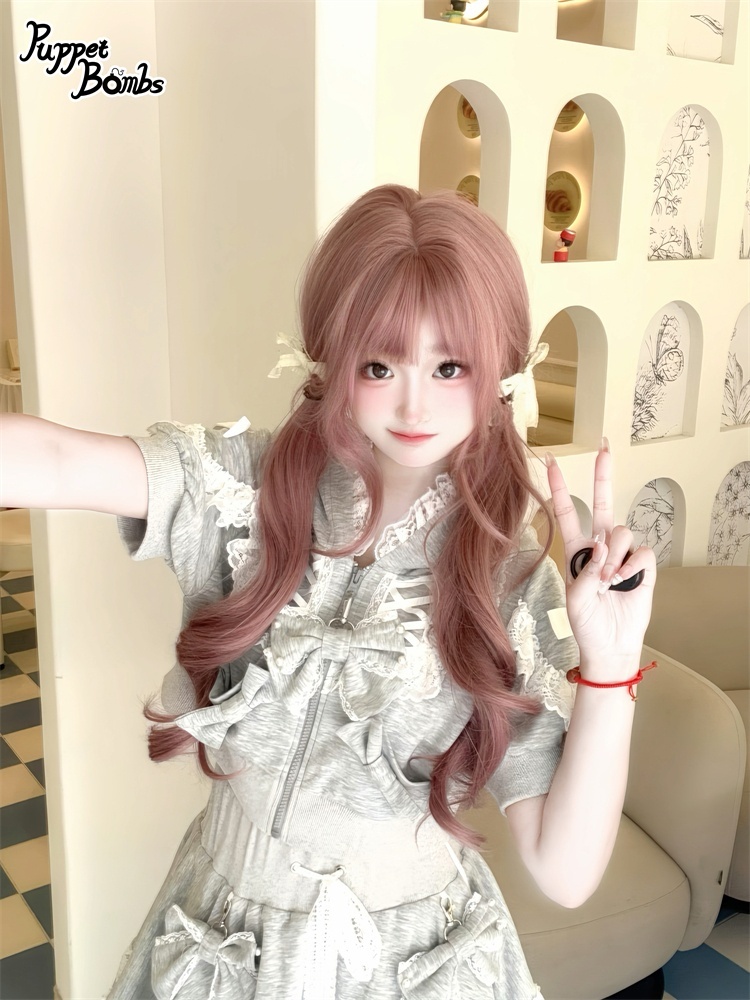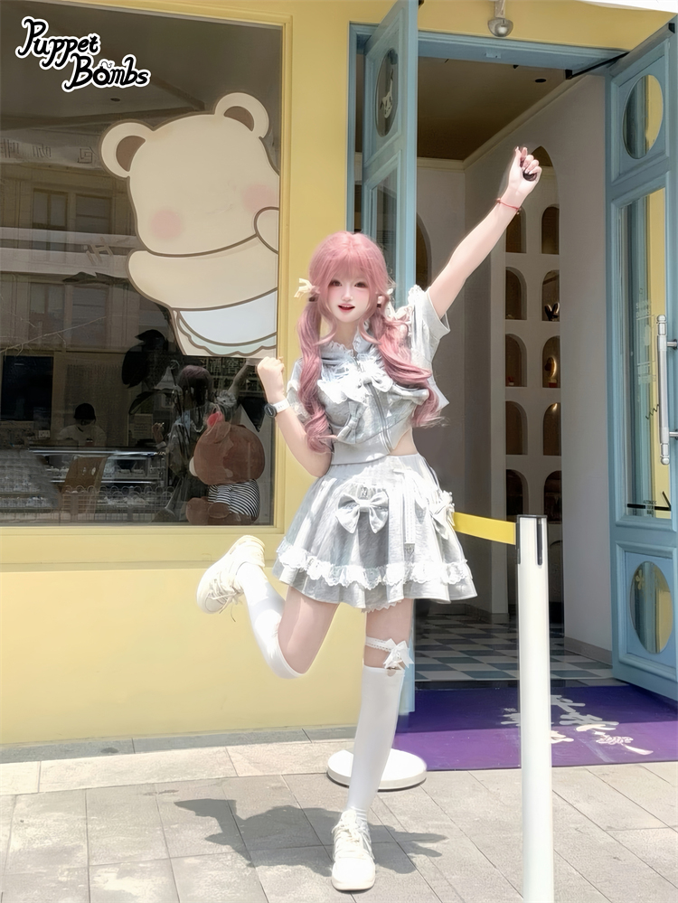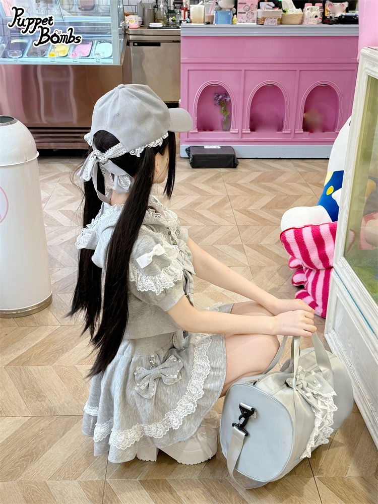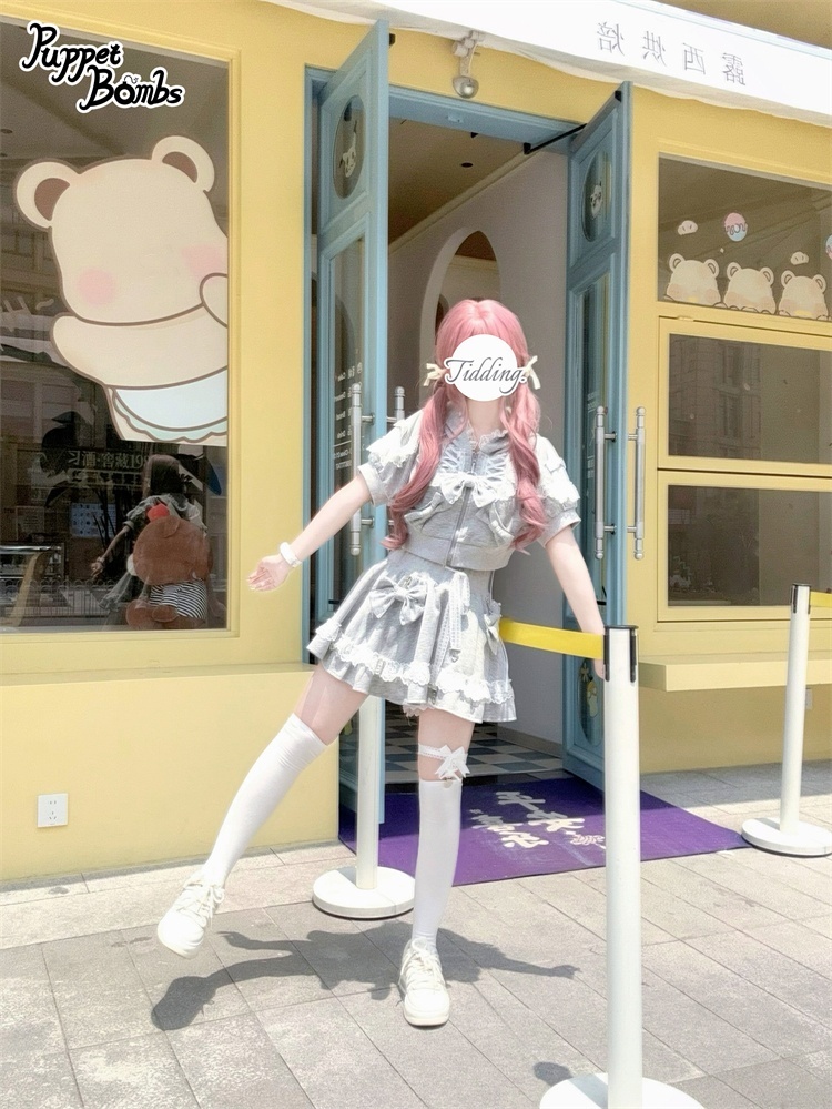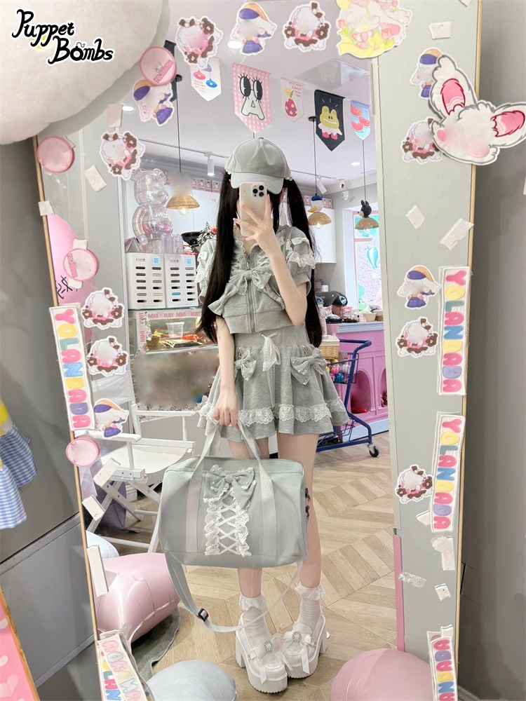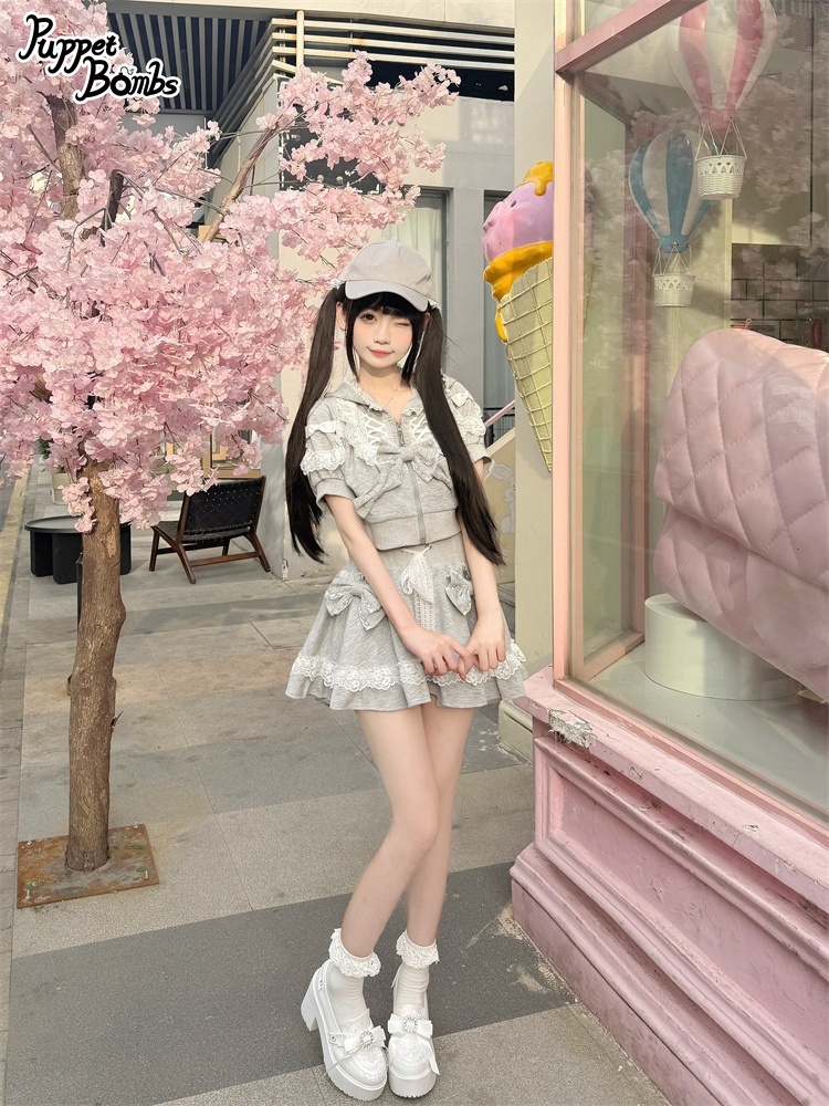 【PuppetBombs】Q461 リボンデコレーションレースアップ半袖パーカー [Q461]