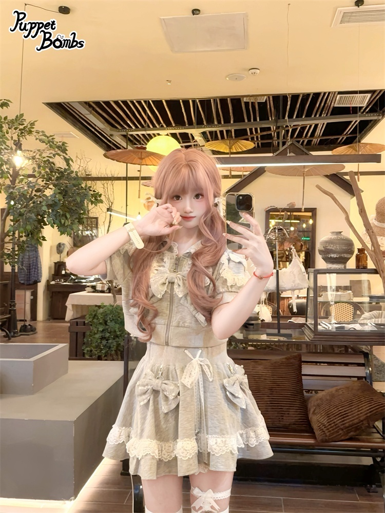 - > 【PuppetBombs】Q461 リボンデコレーションレースアップ半袖パーカー