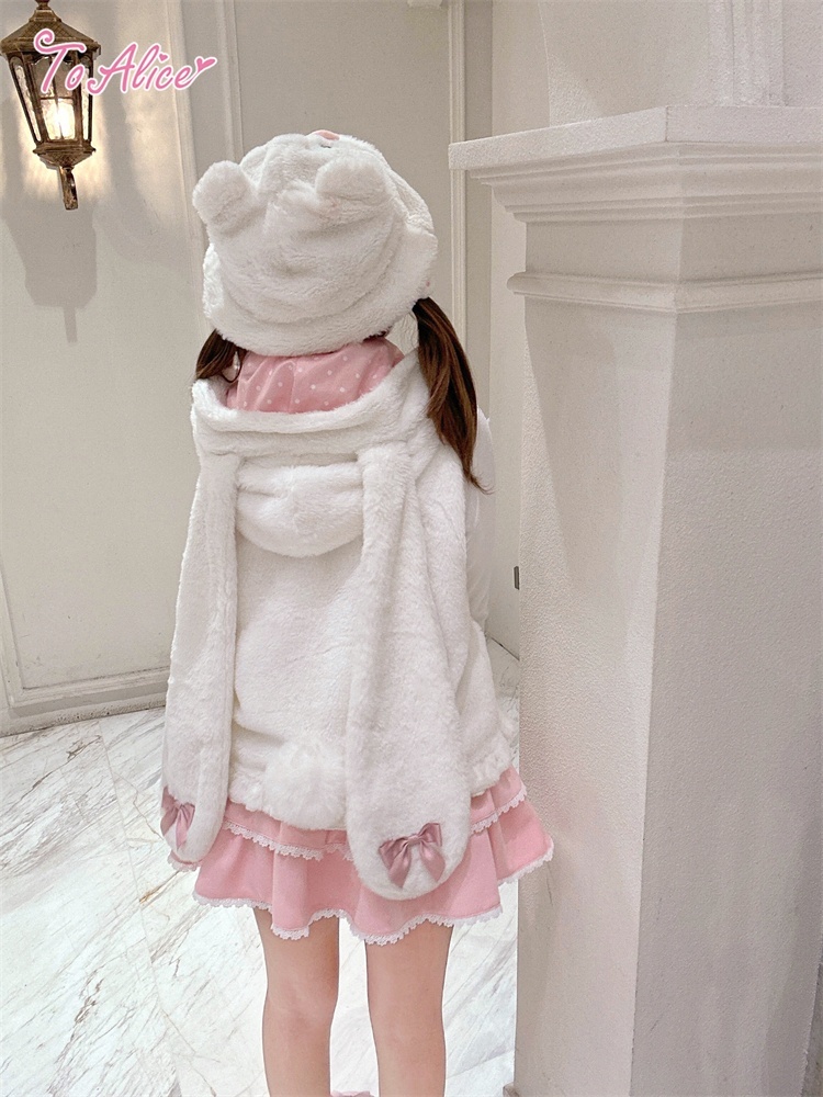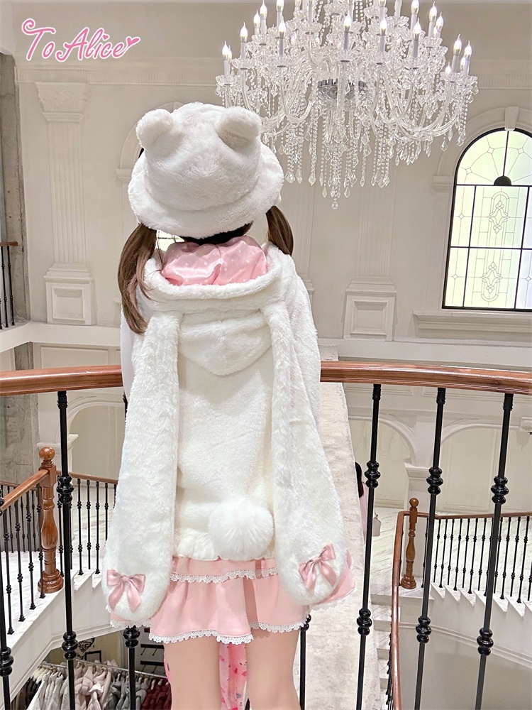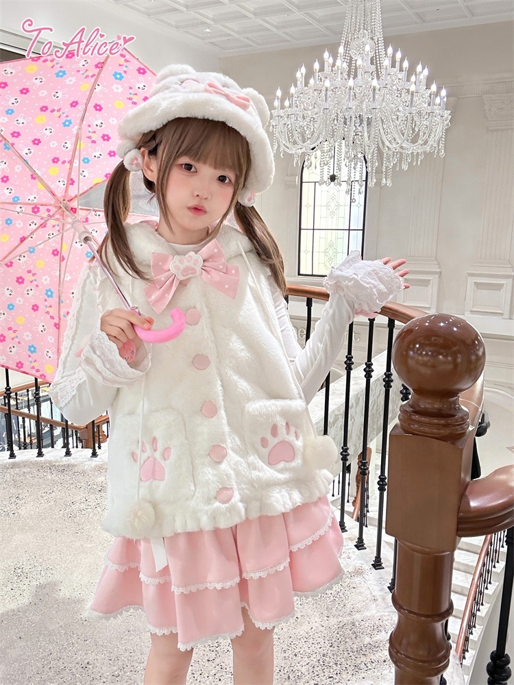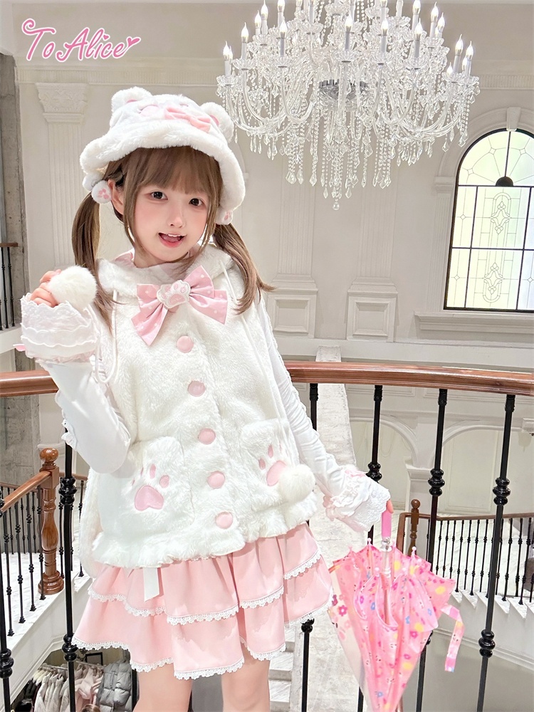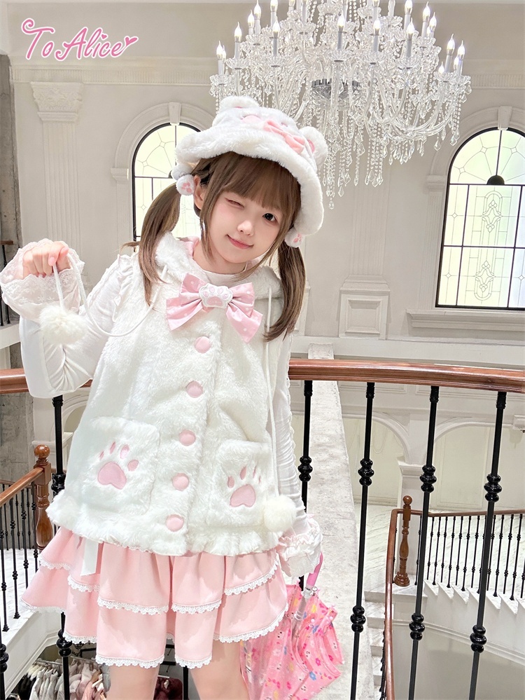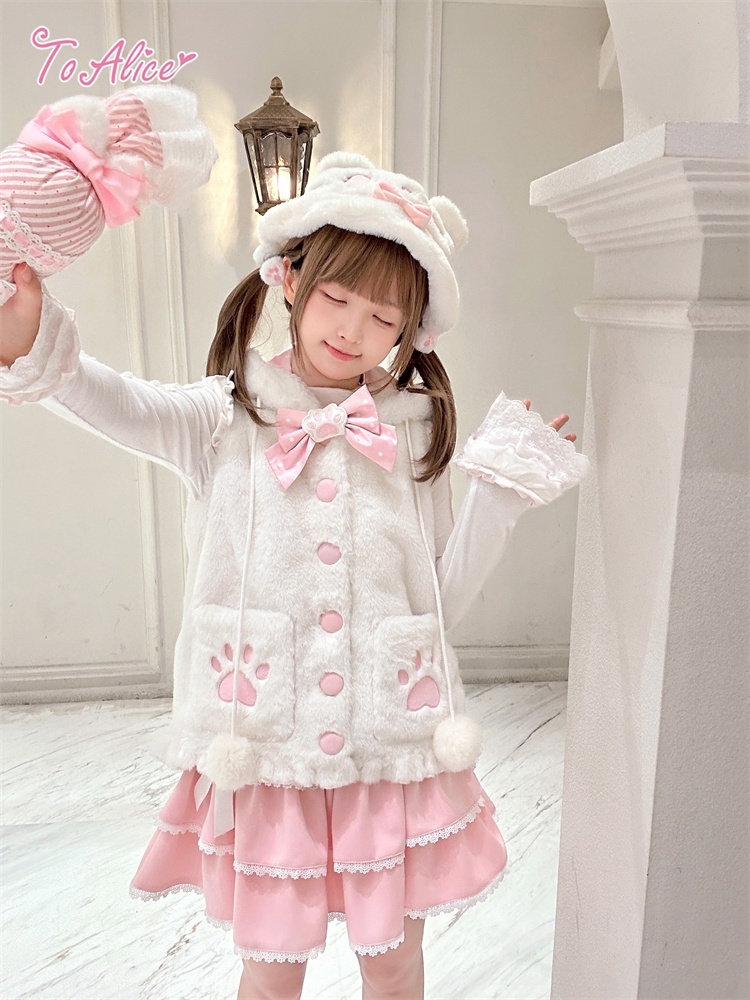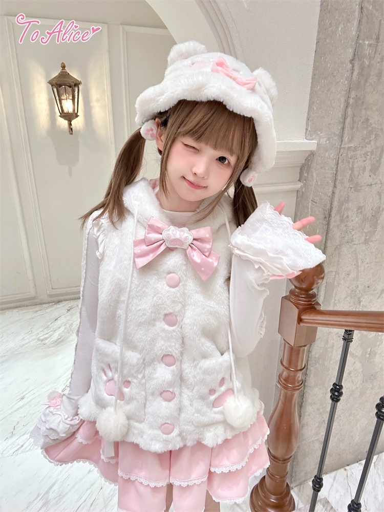 肉球モチーフと大きなリボンが可愛い、うさ耳フード付きふわふわベスト。