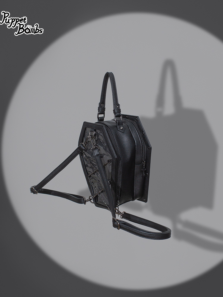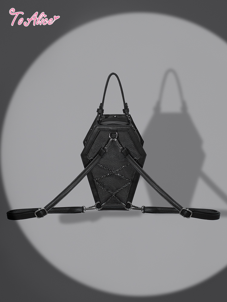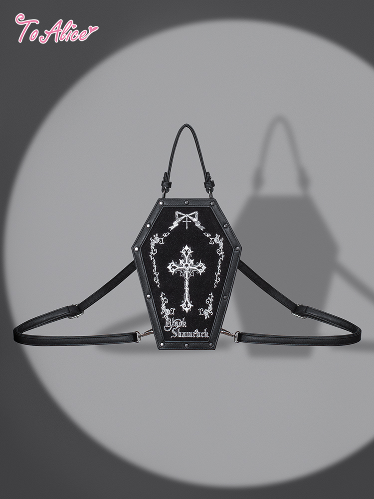 十字架デザインの棺桶型リュック、ハンドバッグ2Wayのバッグ。