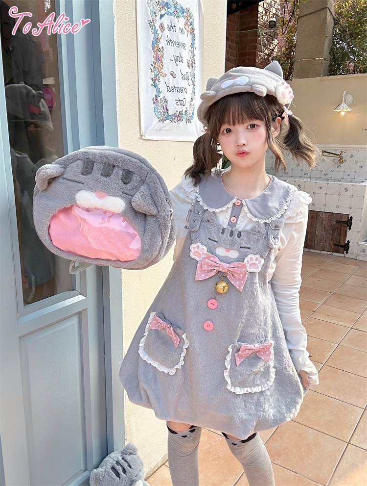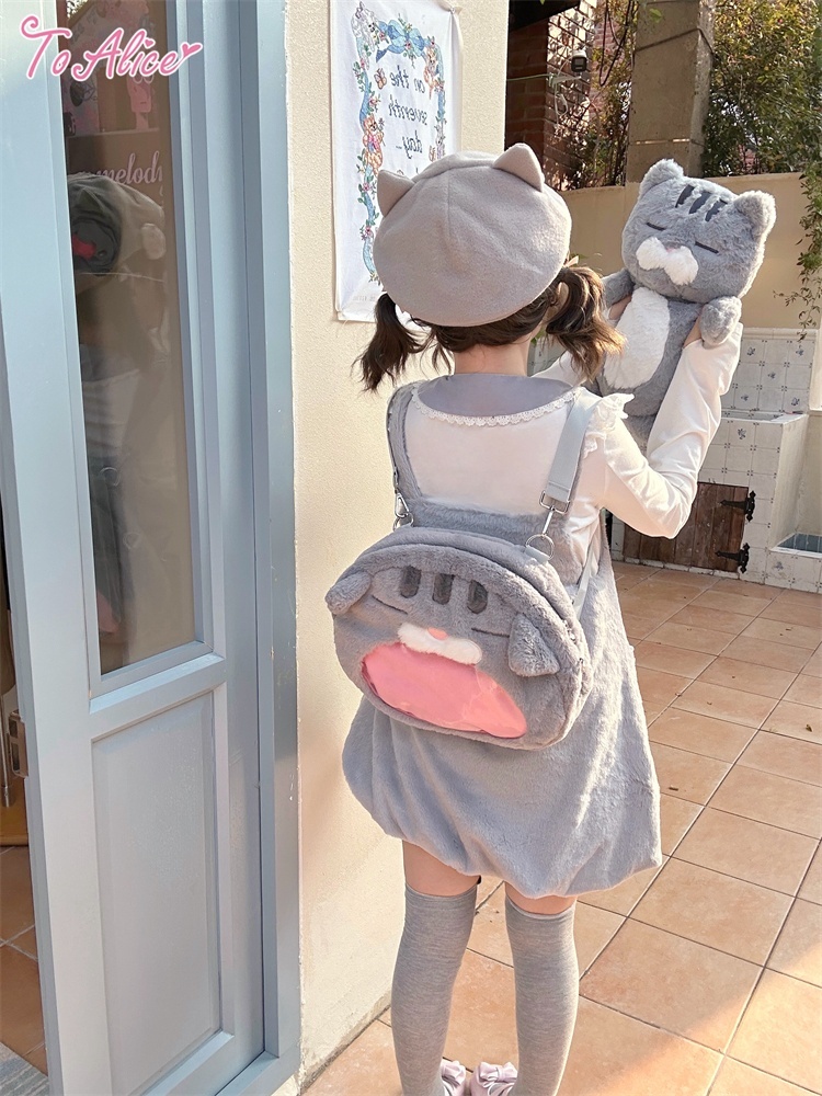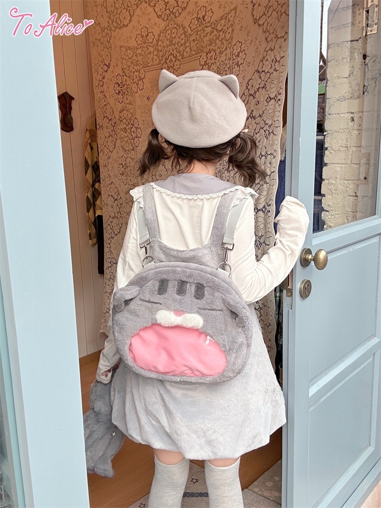 モコモコ素材のネコちゃんフェイスバッグ。リュック、ショルダーバッグの2Way仕様。