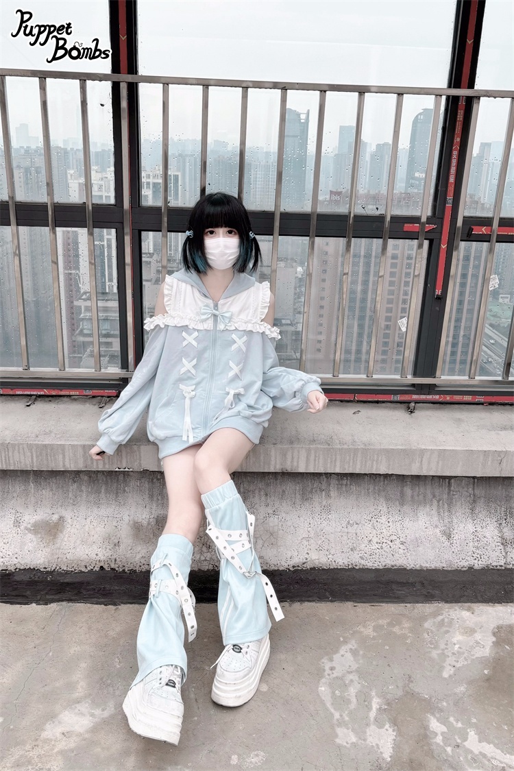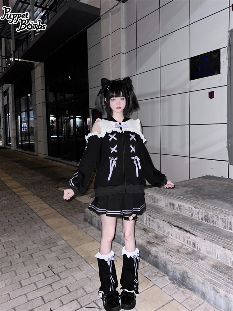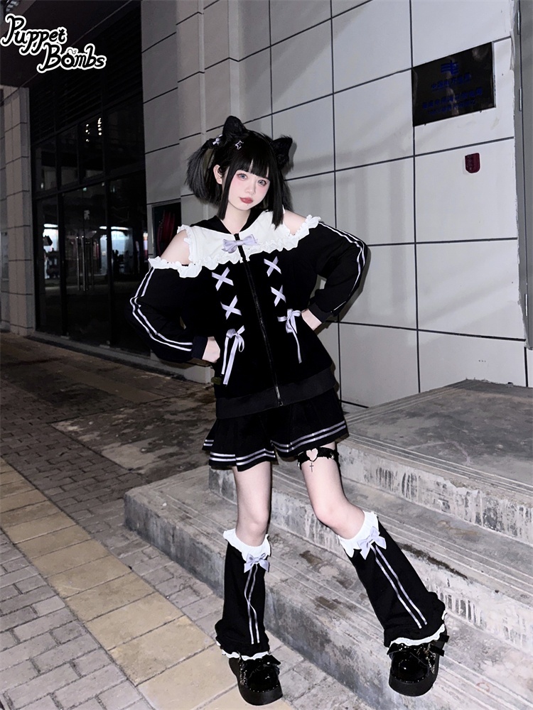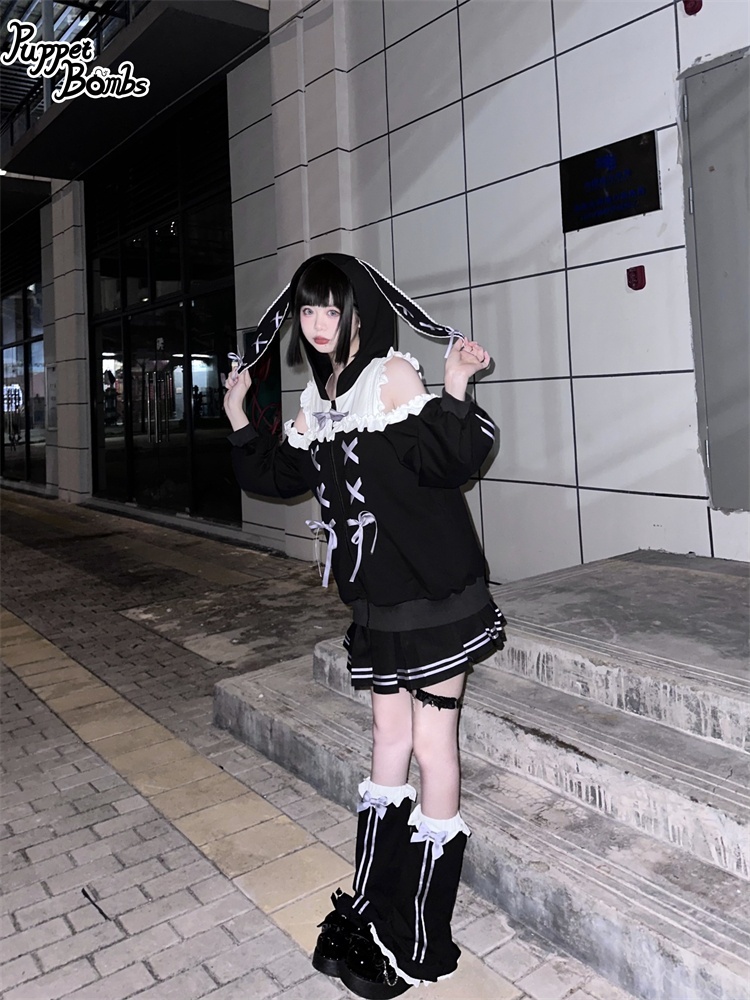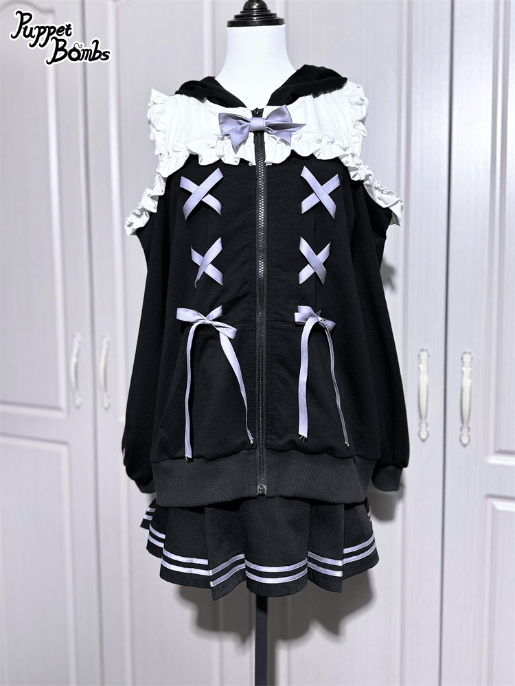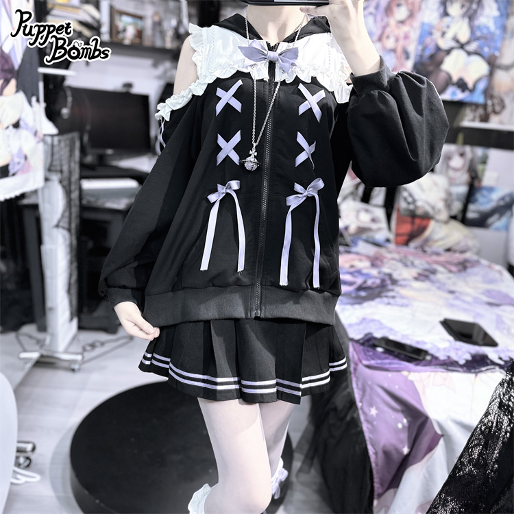 - > 【PuppetBombs】Q14オープンショルダーレースアップパーカー