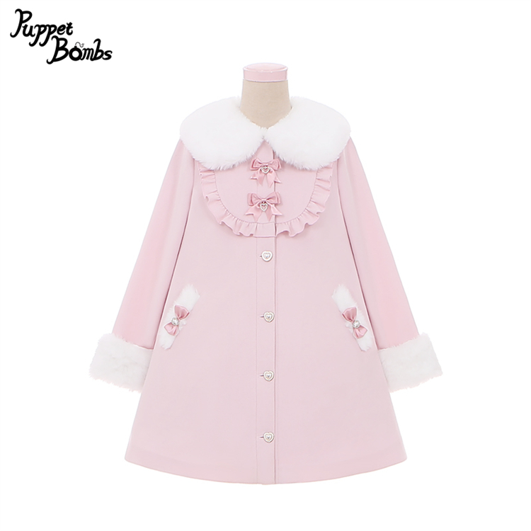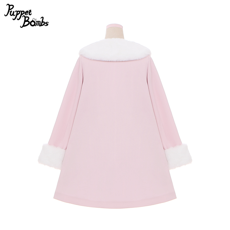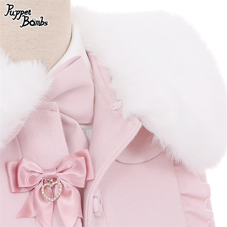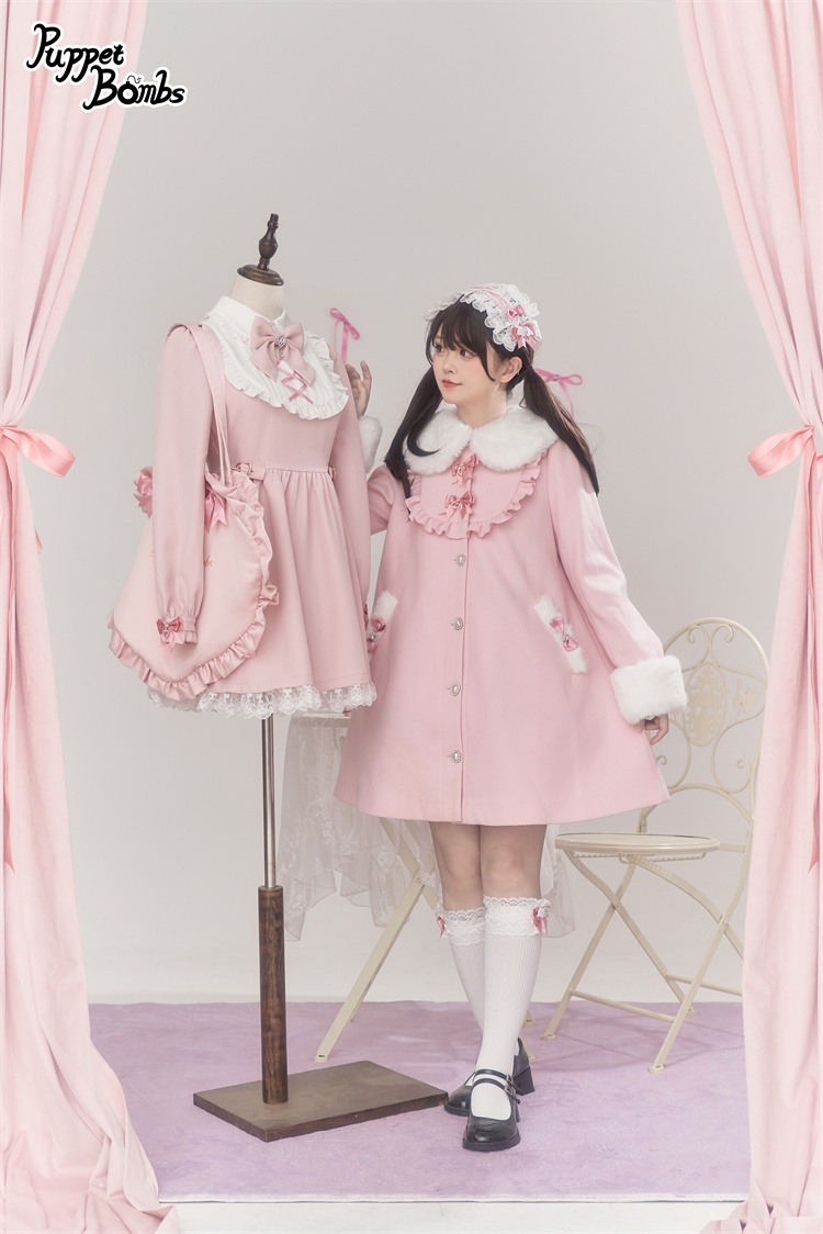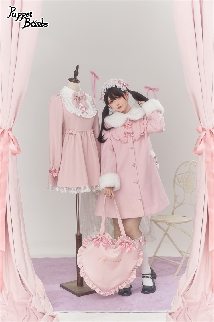 襟元とお袖がファー素材のコート、ビジューリボン付きのワンピース、ヘッドドレス、ソックス、ハートのフリルトートバッグの計5点!