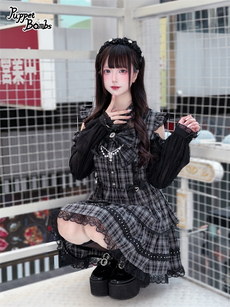 【送料無料】Q489 リボンオープンショルダーチェックワンピース《予約受付》