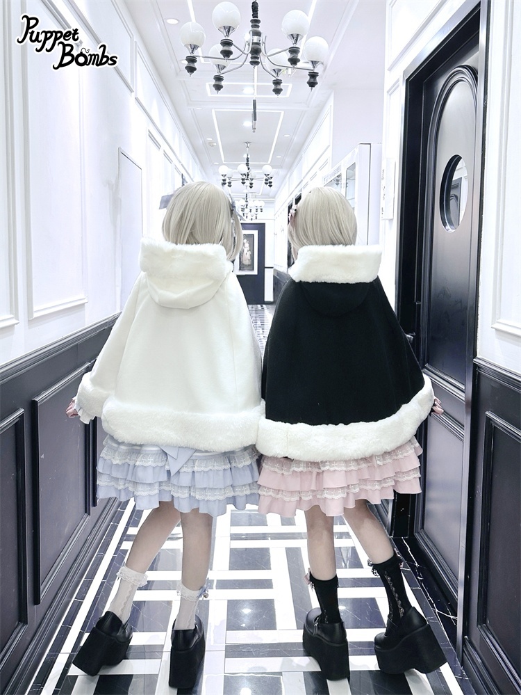 フードと裾をふわふわのファーで縁取った、ハートのポケット付きのポンチョ風コート。