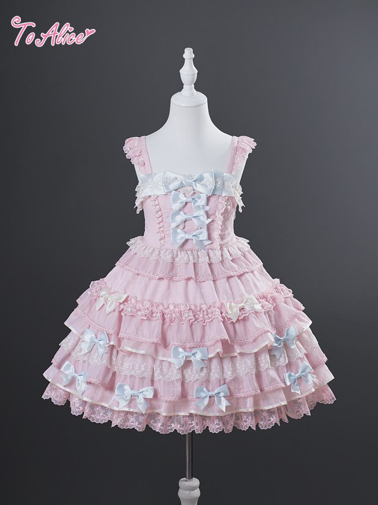 リボンが沢山ちりばめられたパステルカラーのジャンパースカート。