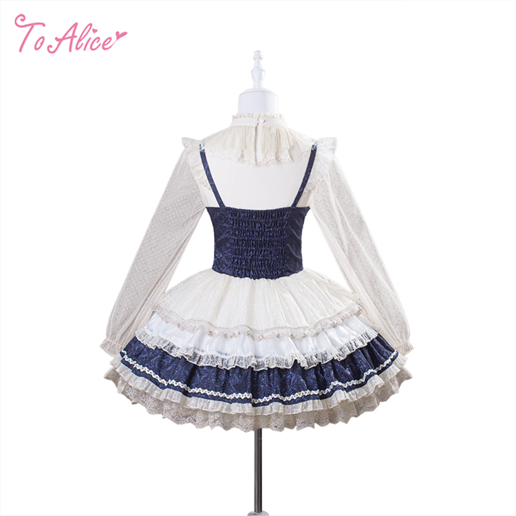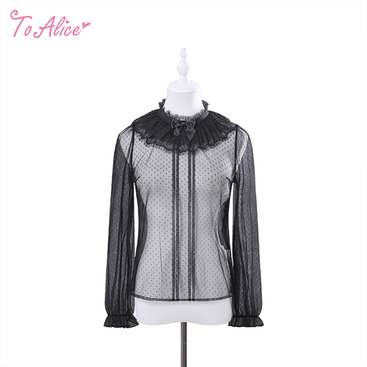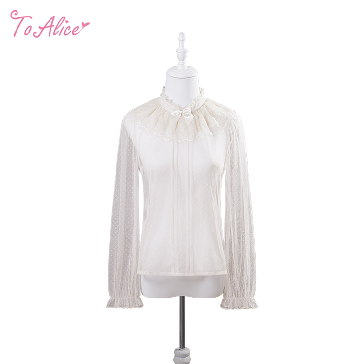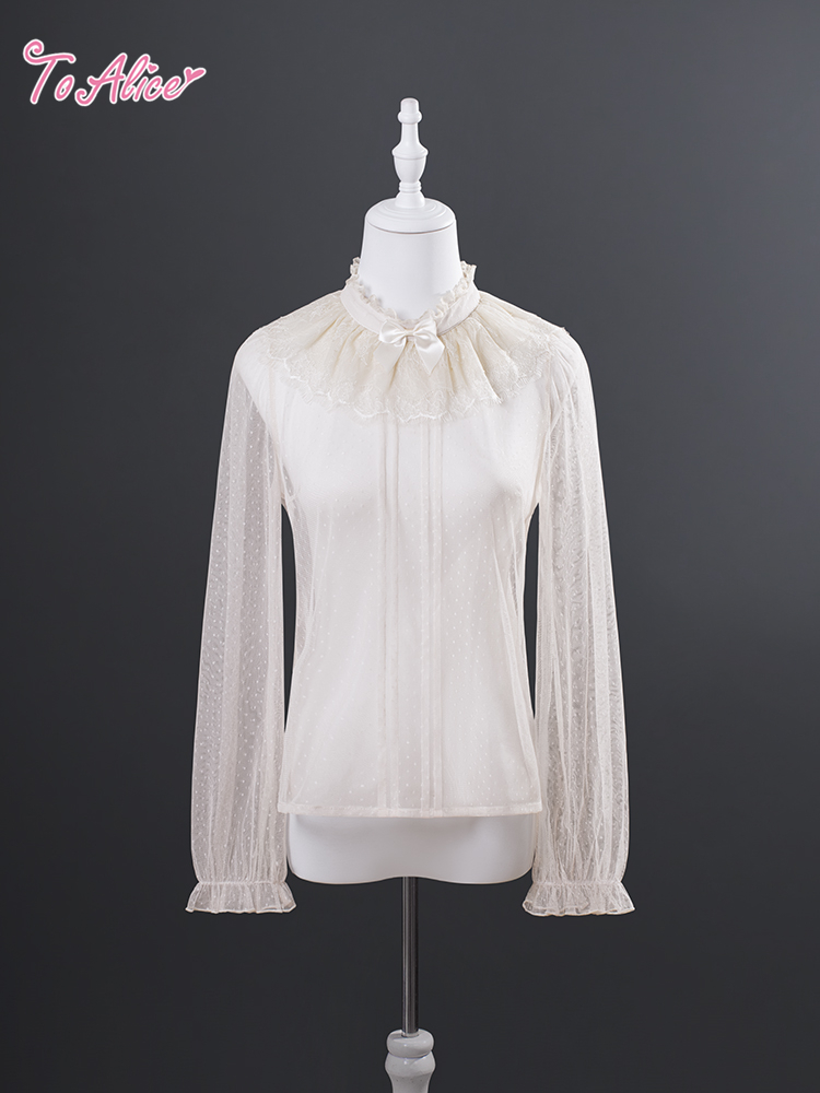 ドットシフォン素材のスタンドカラー長袖トップス。