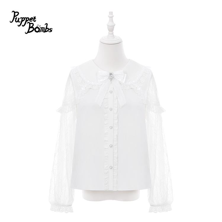 【PuppetBombs】Q516 ビジューリボン付総レーススリーブフリルブラウス [Q516]