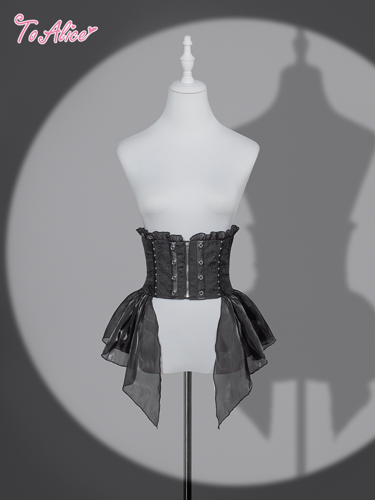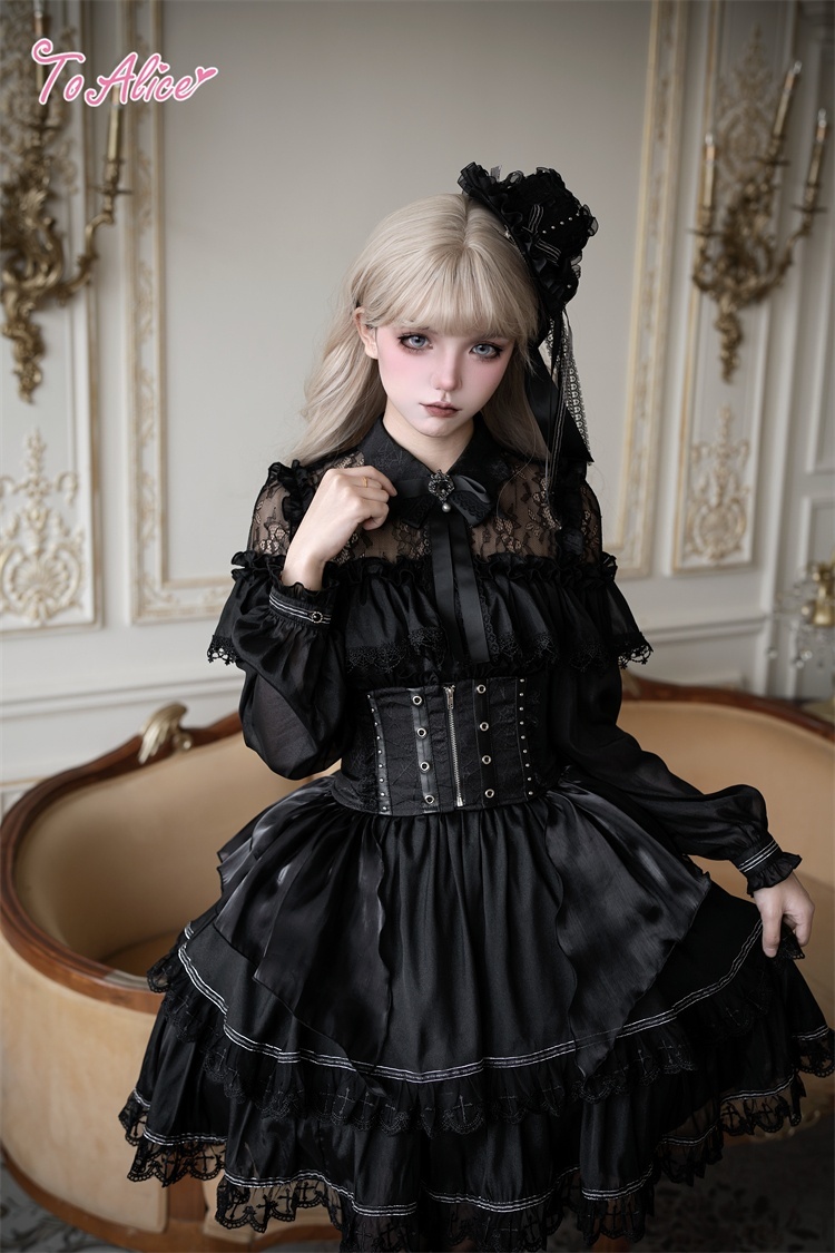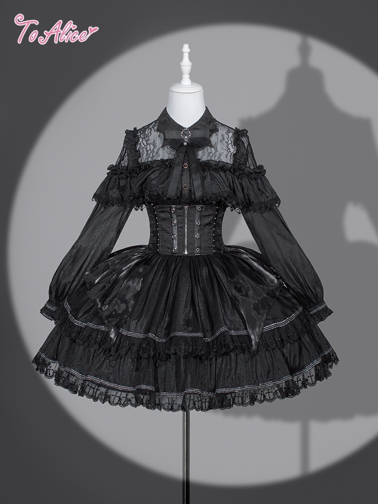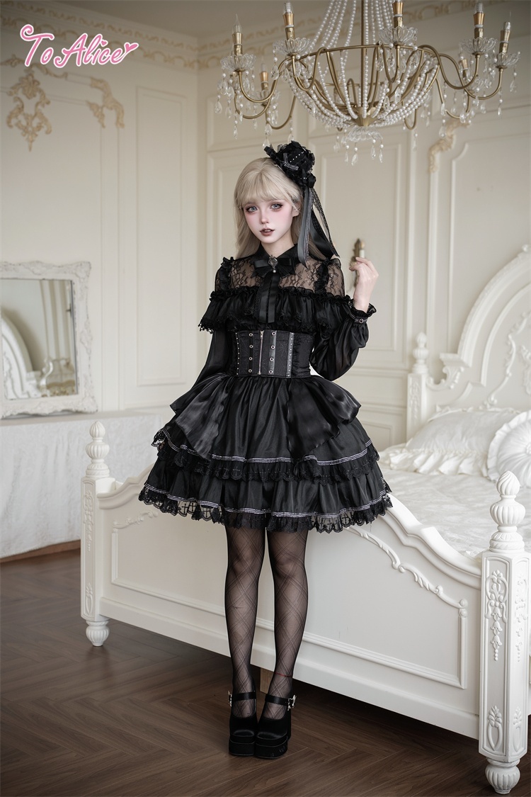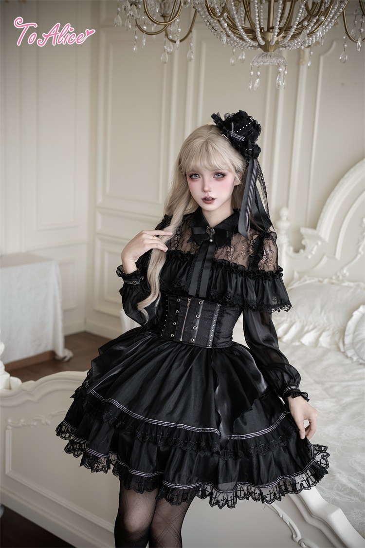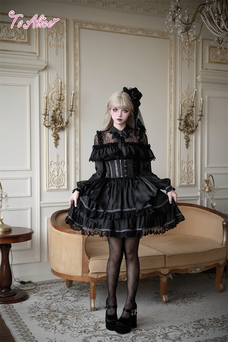 コウモリ風の襟とデコルテのレース切り替えがポイントのワンピース。コルセット風ベルト付き。