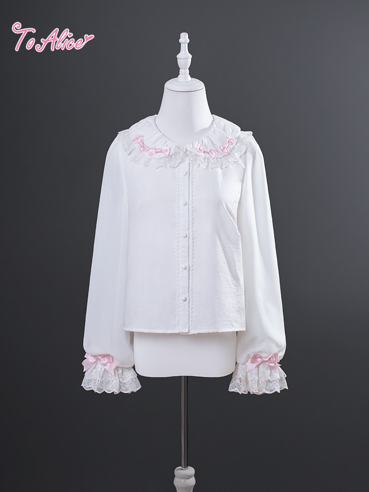 襟元と袖口にあしらわれた小さなピンクのリボンが愛らしい、重ね着にもぴったりな贅沢フリルの丸襟ブラウス。
