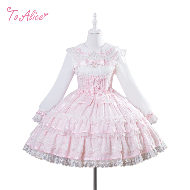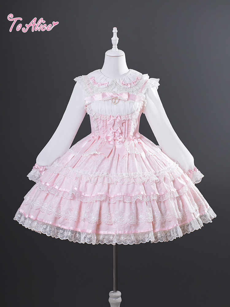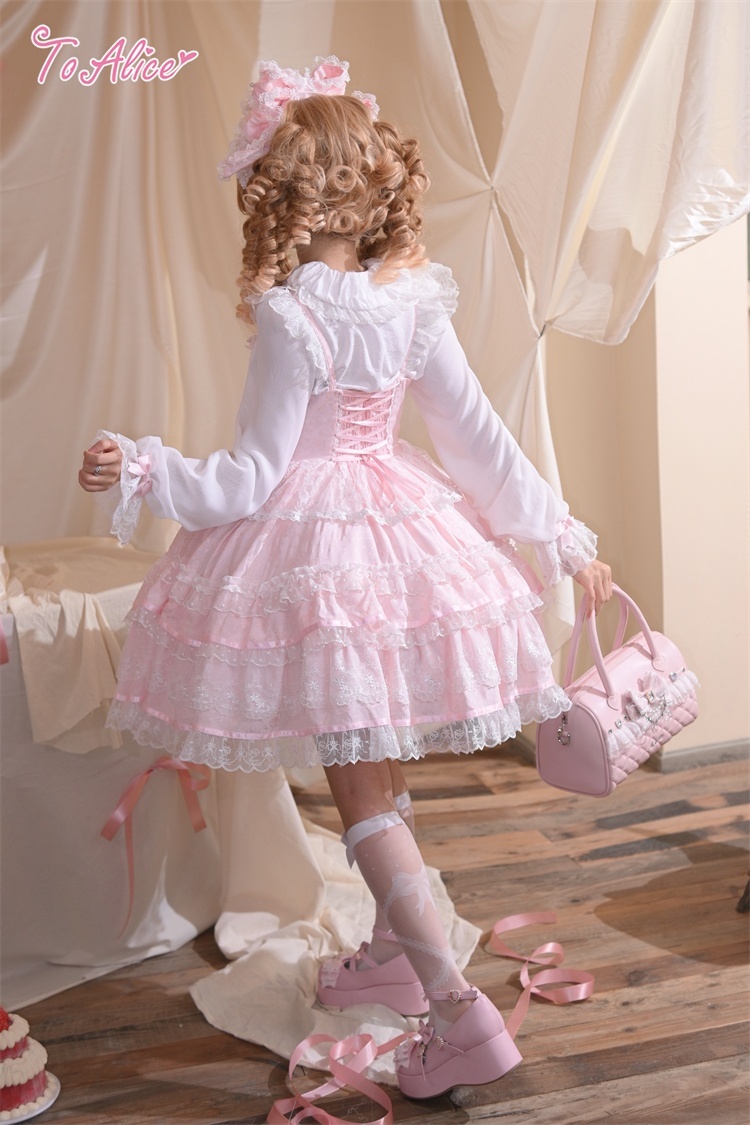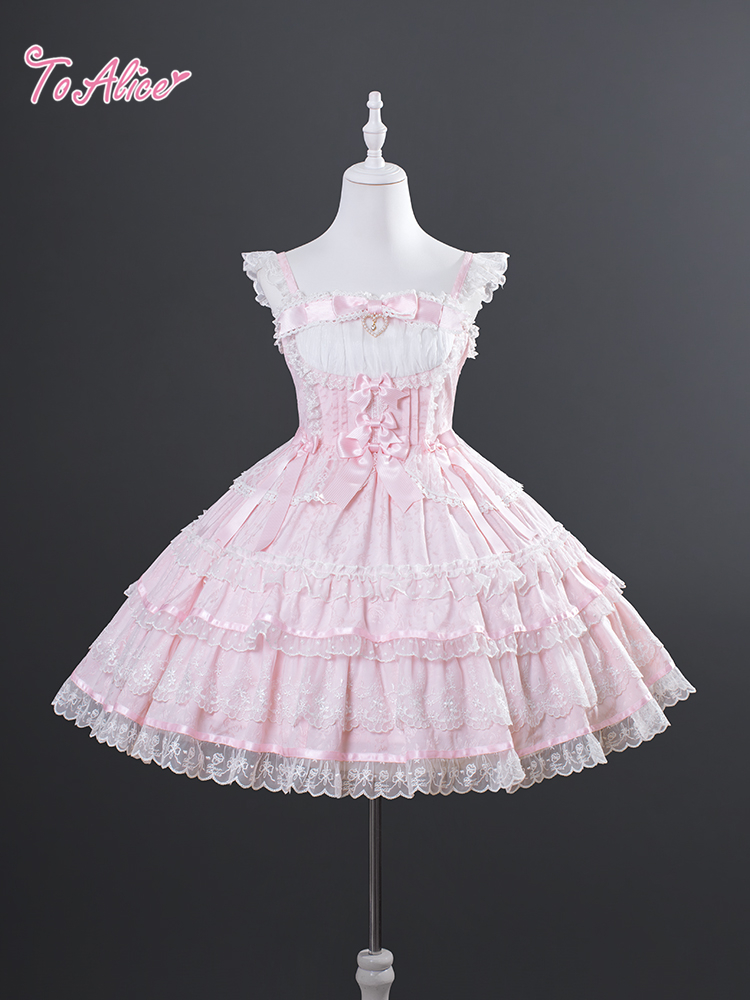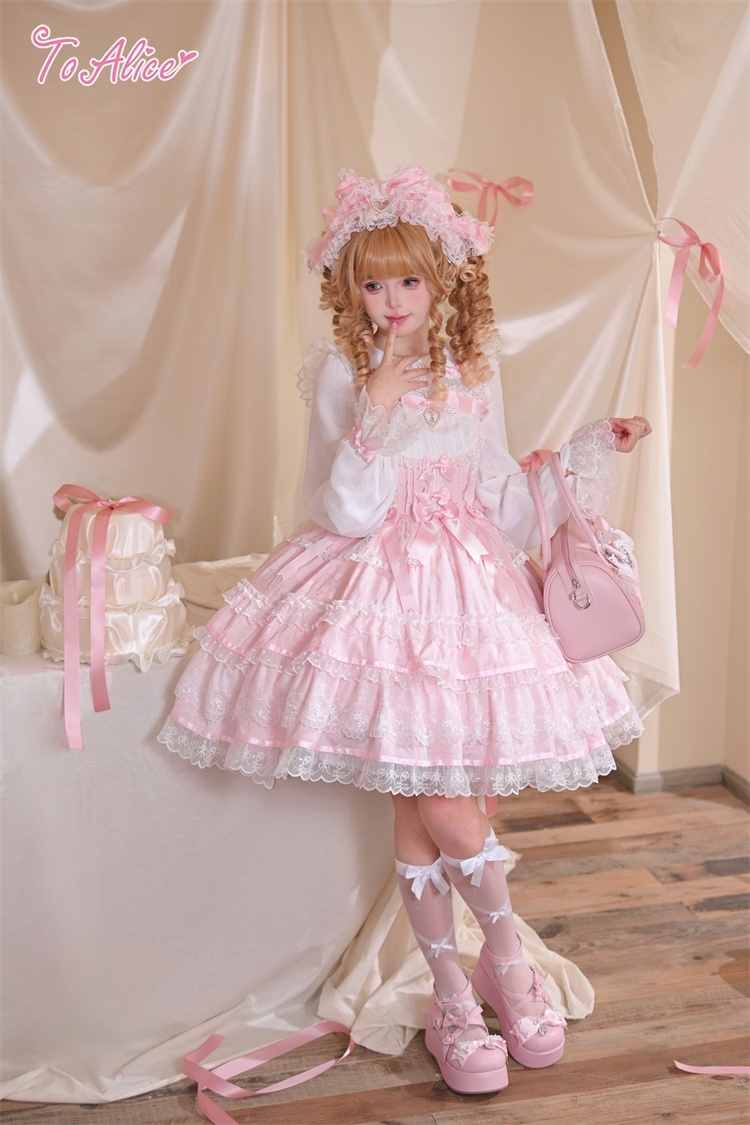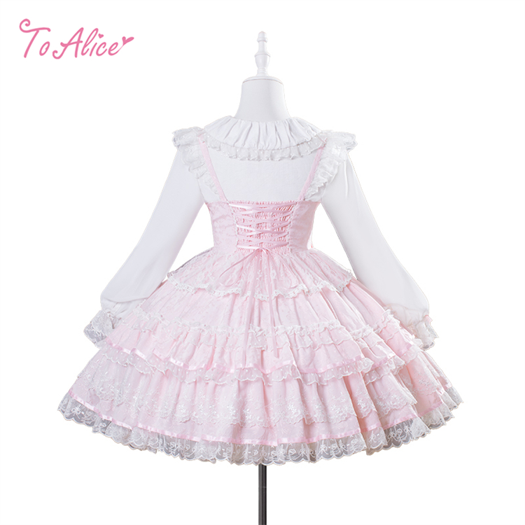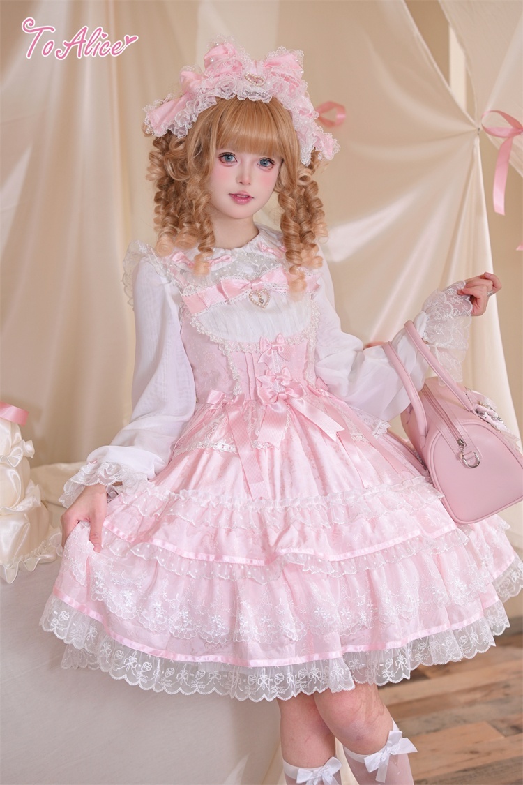 上品に浮かび上がるジャカード生地に、繊細なフリルと編み上げデザインを詰め込んだお姫様のようなジャンパースカート。