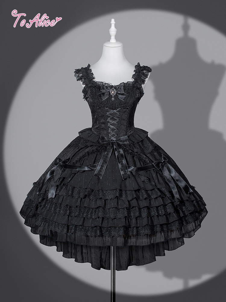重厚感のあるレースを何層にも重ねた、後ろ丈の長いフィッシュテールが優雅なジャンパースカート。