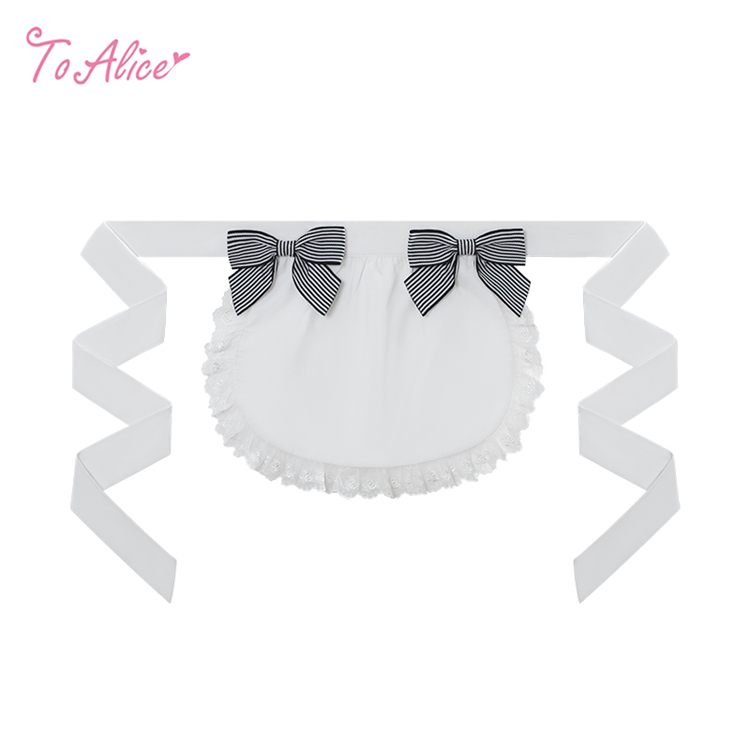 ウエストのモノトーンストライプリボンが全体を引き締める丸型のミニエプロン。