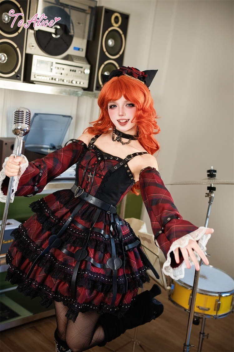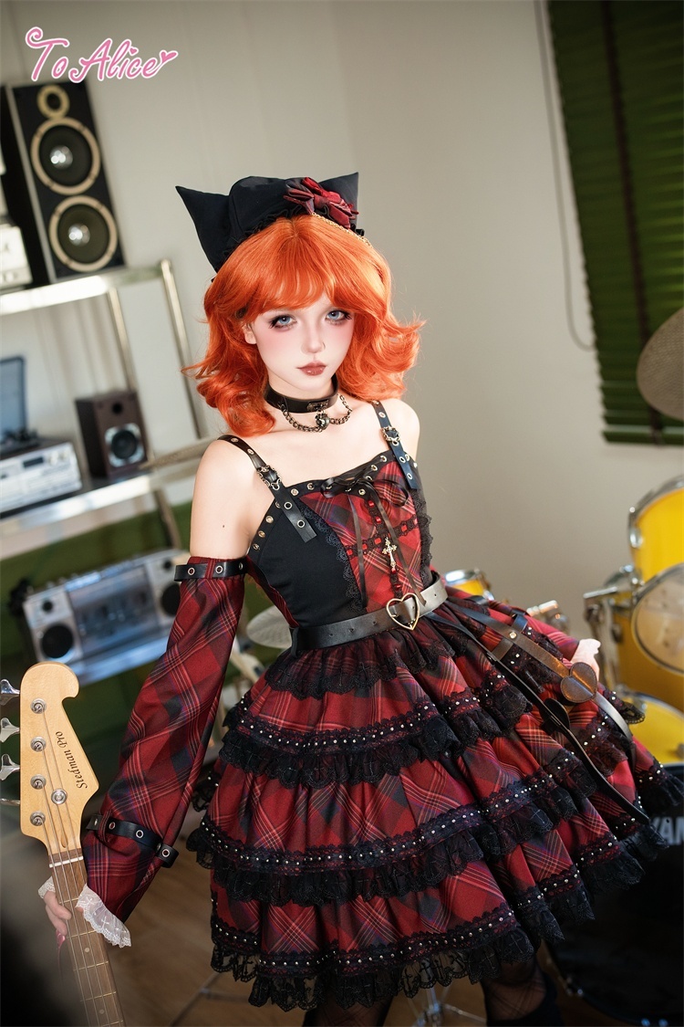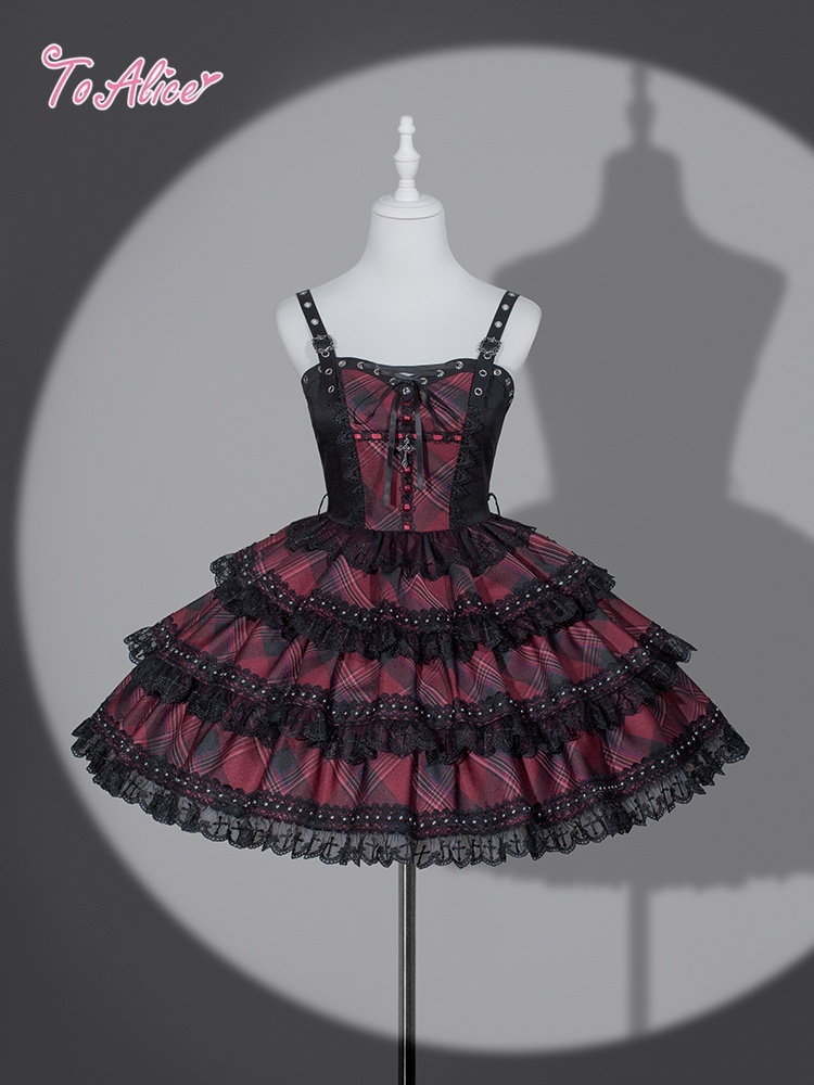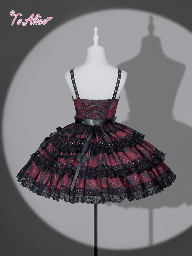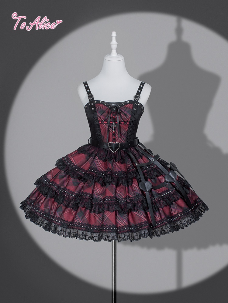 ベルトデザインが辛口な赤チェックと黒のバイカラージャンパースカート。