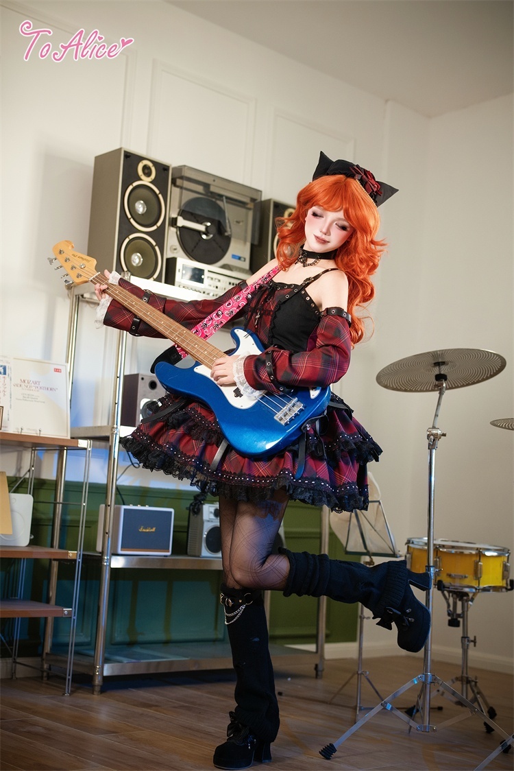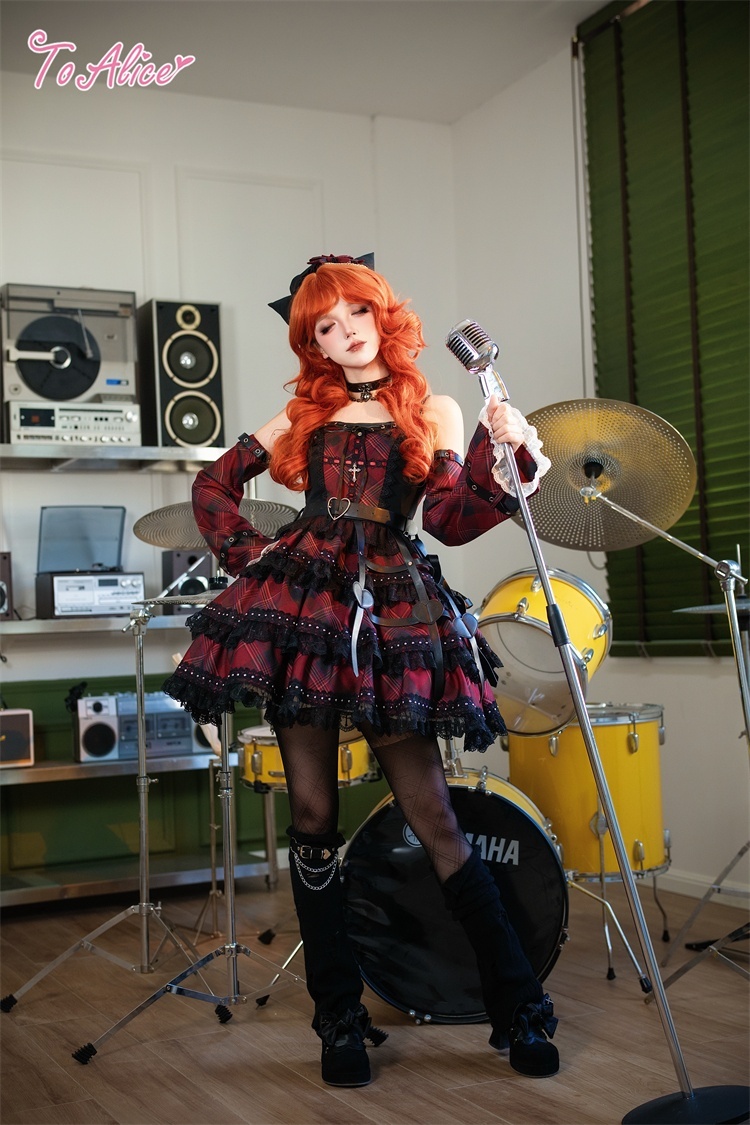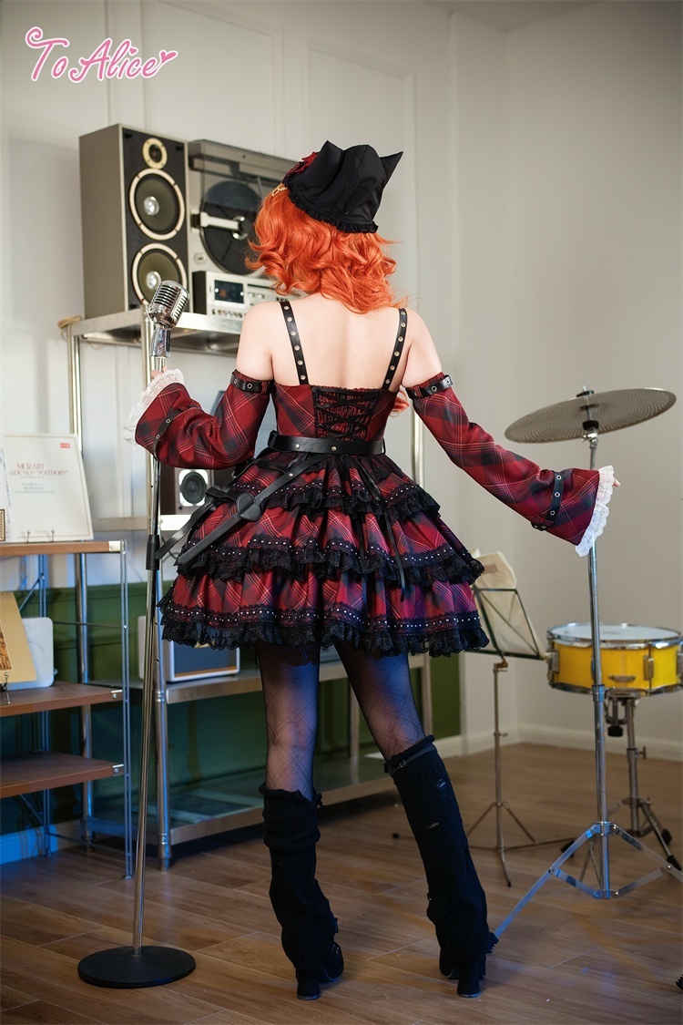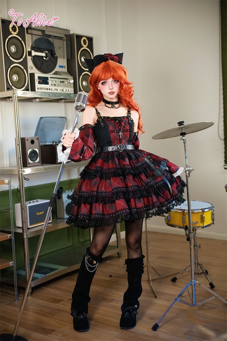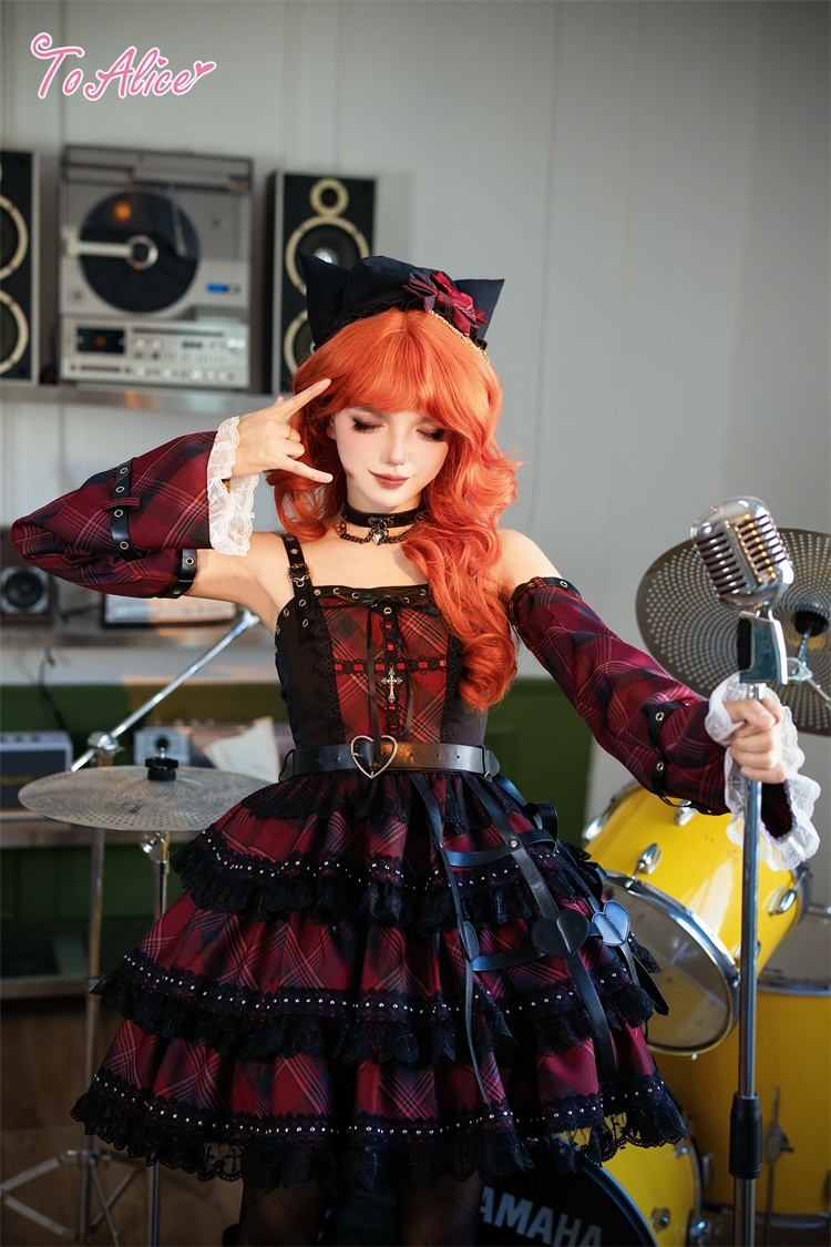 ベルトデザインが辛口な赤チェックと黒のバイカラージャンパースカート。