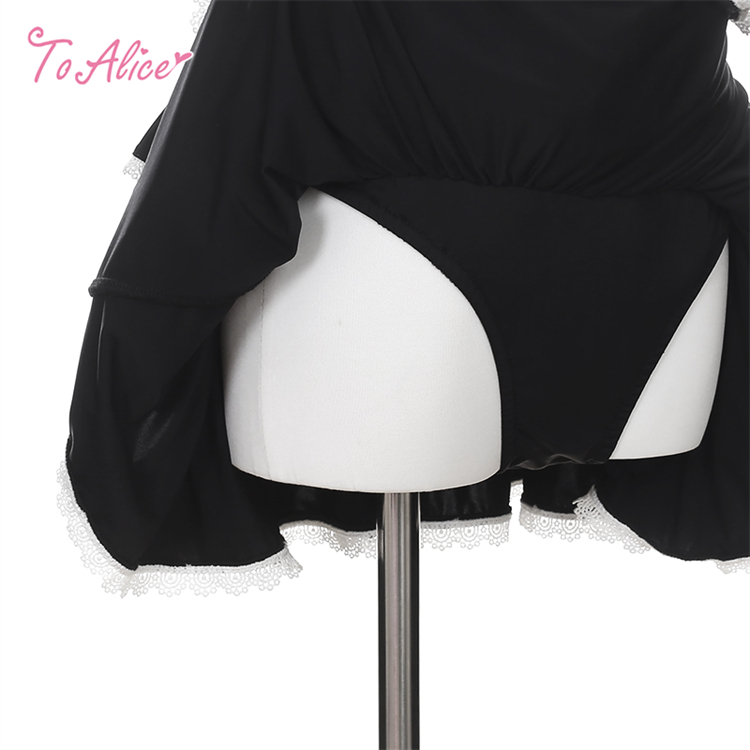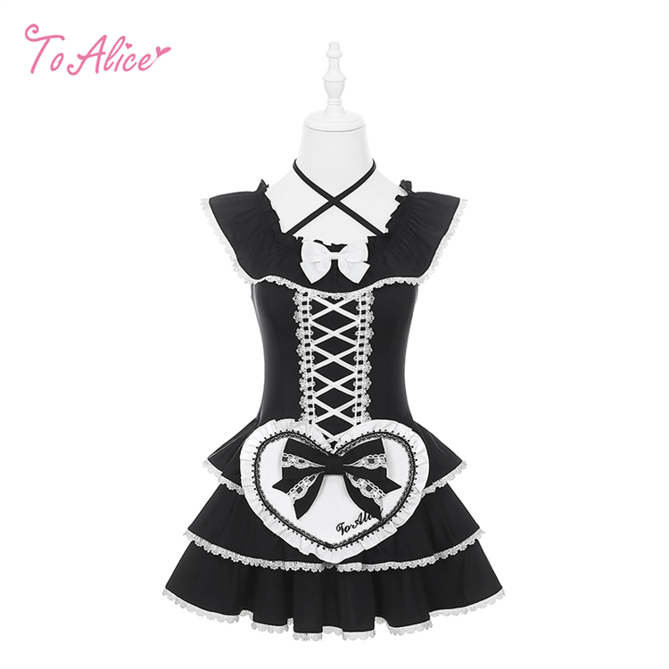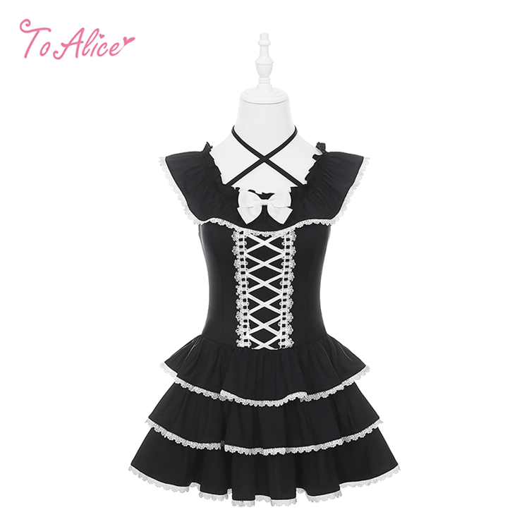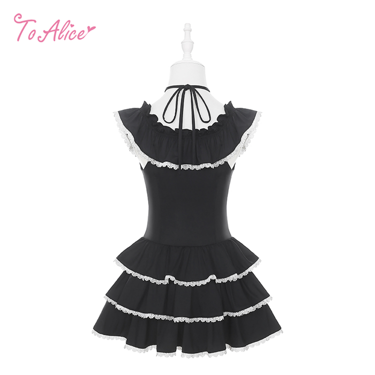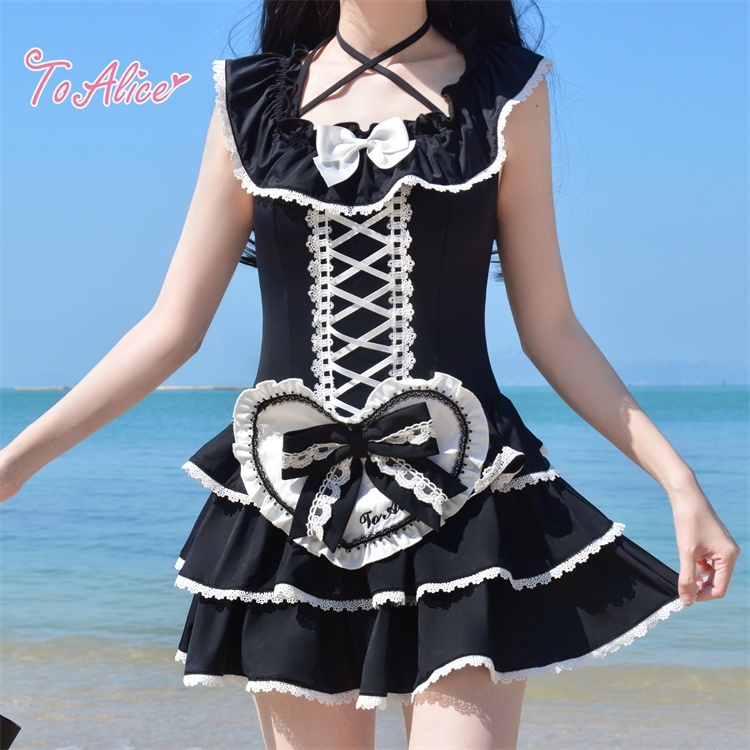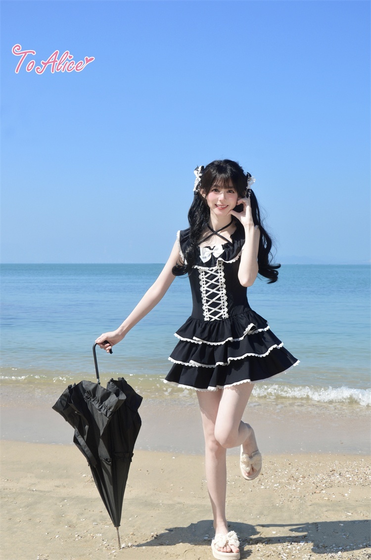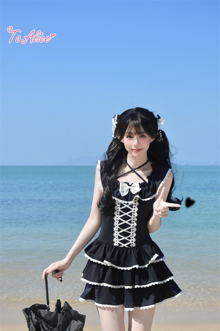 レースアップとティアードスカートがポイントのワンピース型の水着。