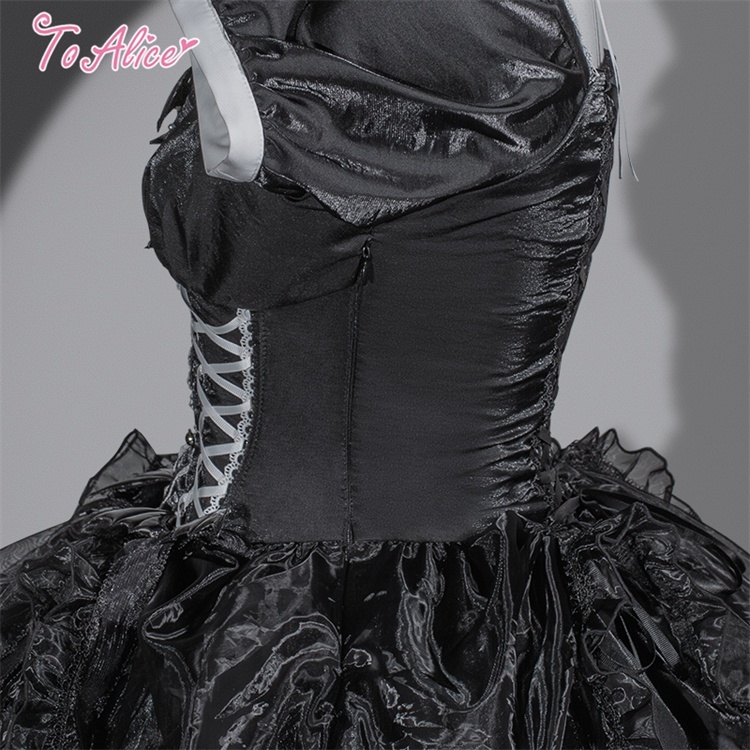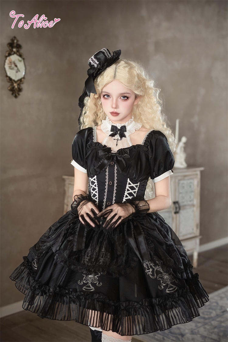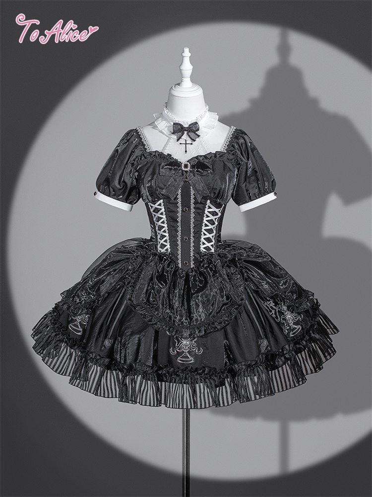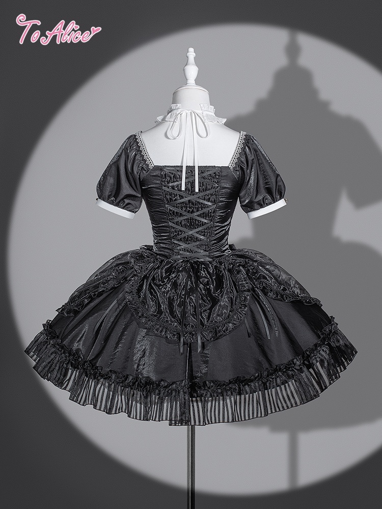 チョーカー風の襟元とウエストの白レースアップが目を惹く、コルセットワンピース。