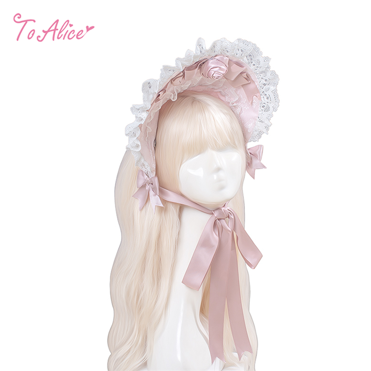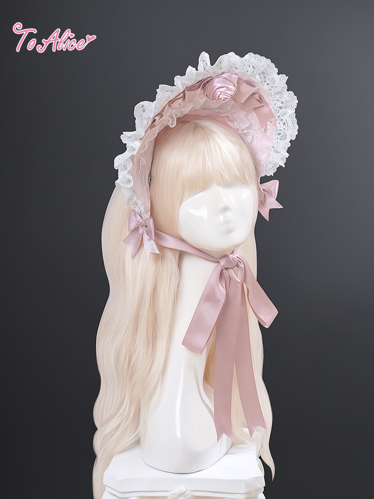たっぷりのレースフリルにピンクのバラとリボンをあしらったハーフボンネット。