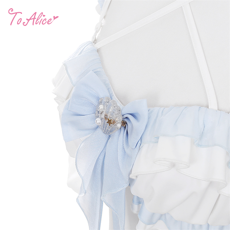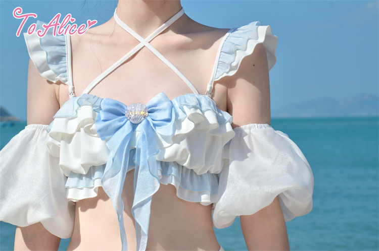 リボンとフリルがたっぷりあしらわれた透け感のあるくらげモチーフのビキニ。