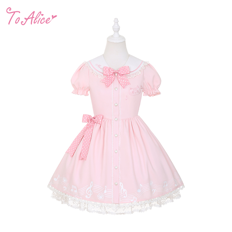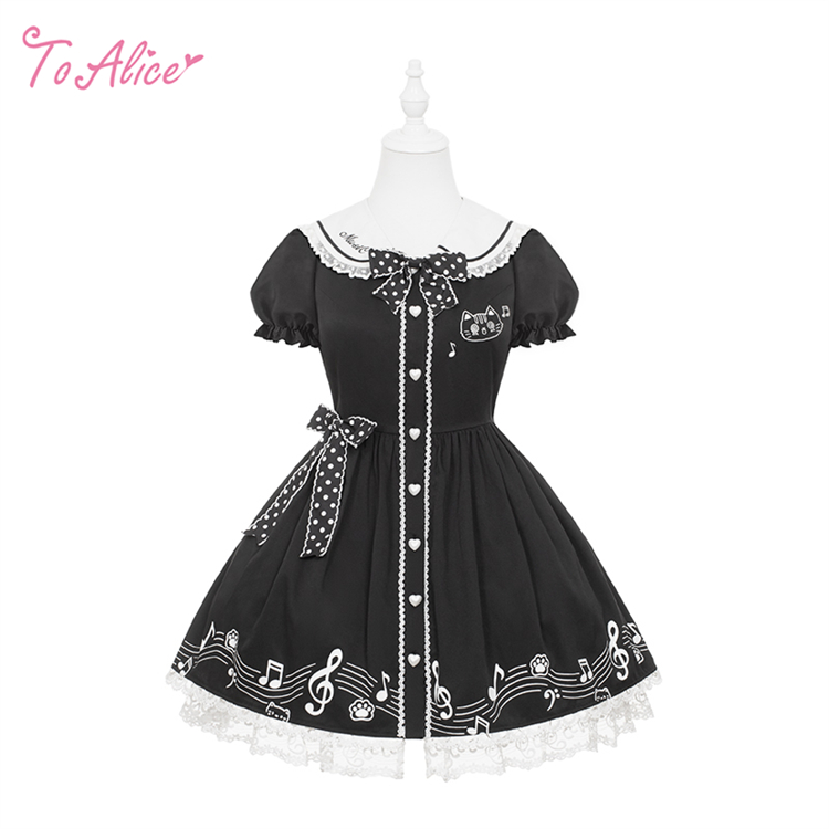 胸元のねこちゃんと、スカートの裾に広がる五線譜がポイントのワンピース。