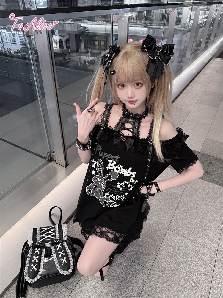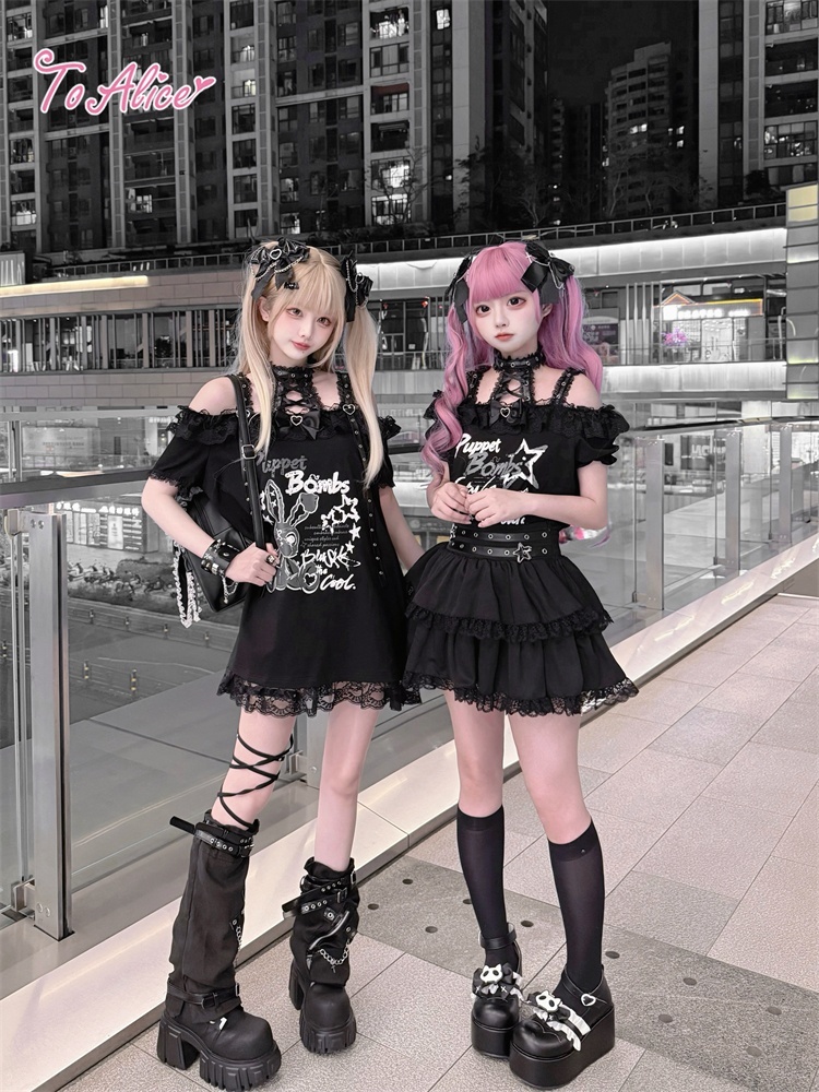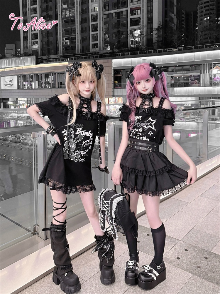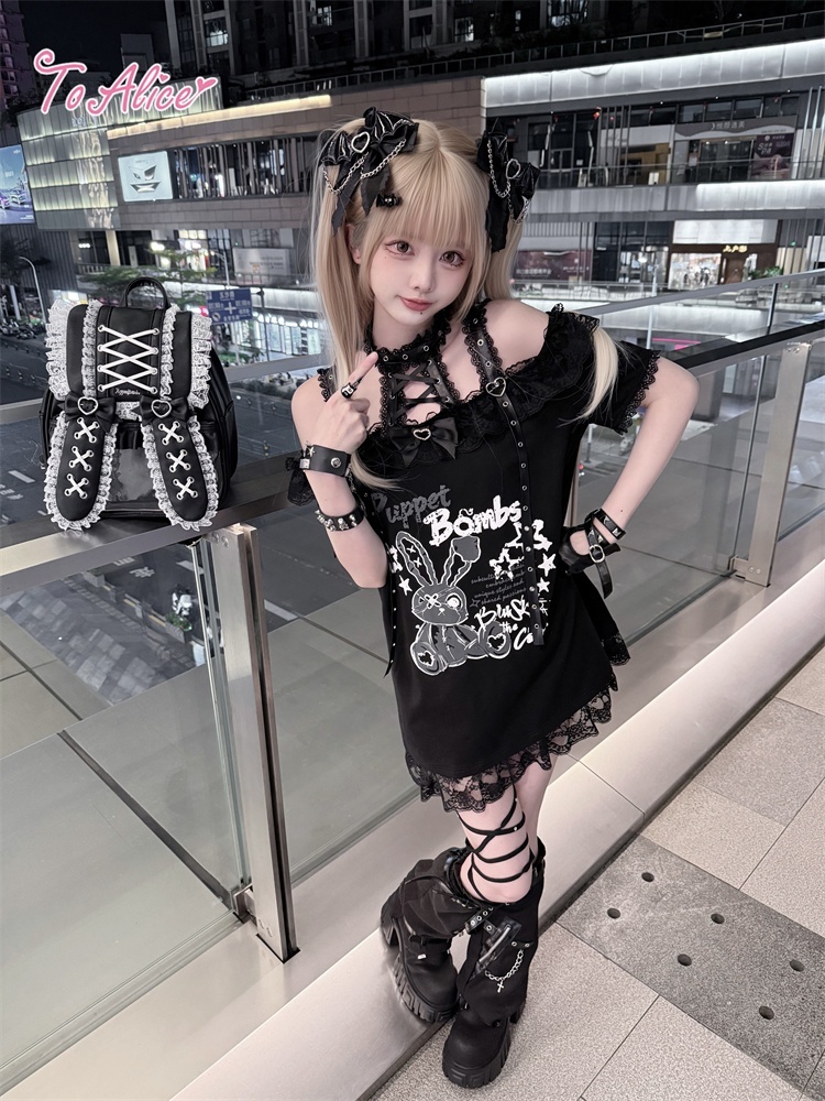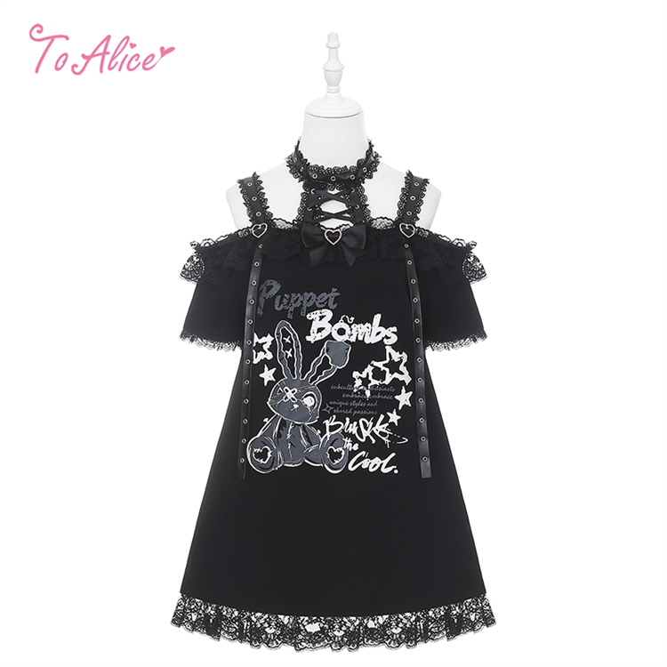 首元のレースアップとうさぎのプリントが映える、病み可愛い地雷系オフショルワンピース。