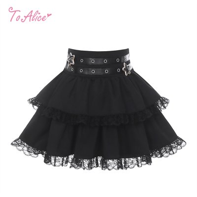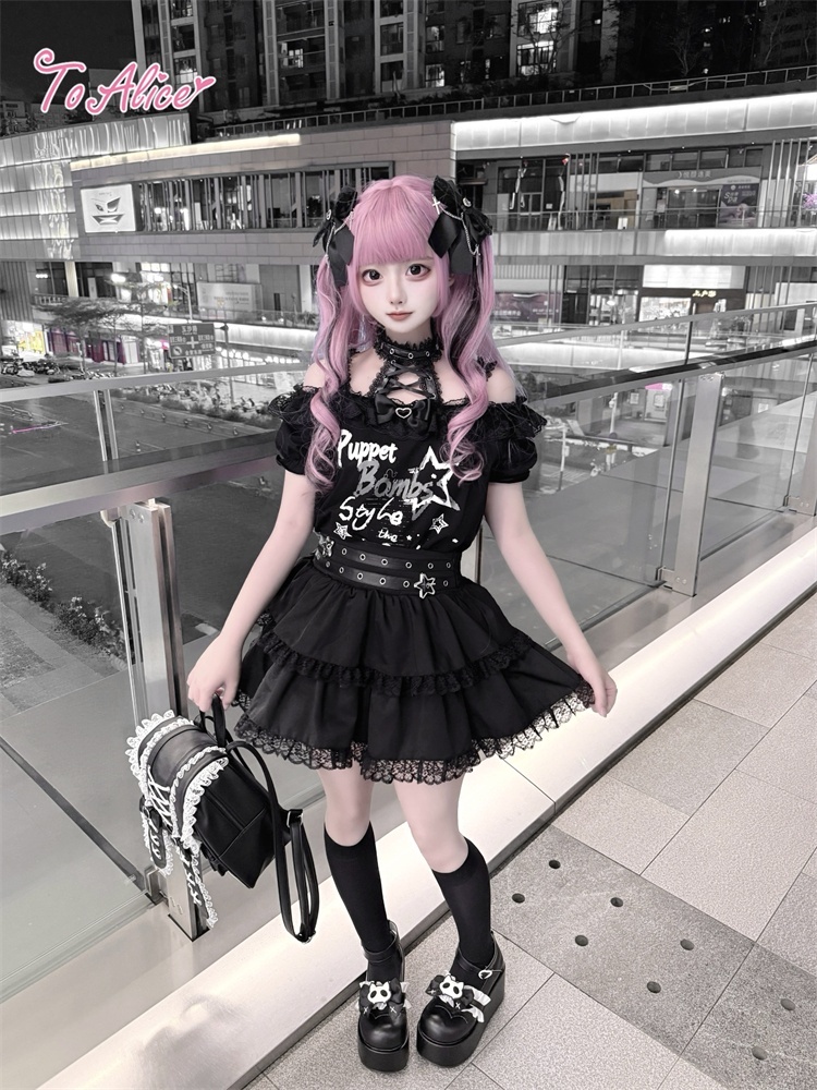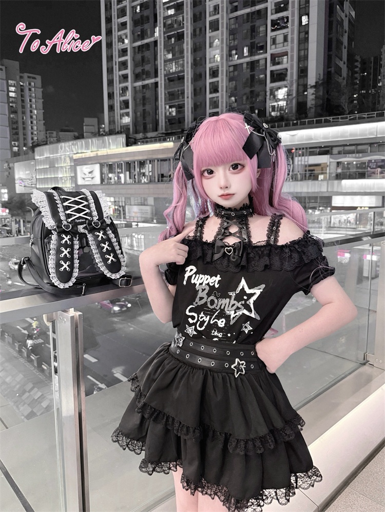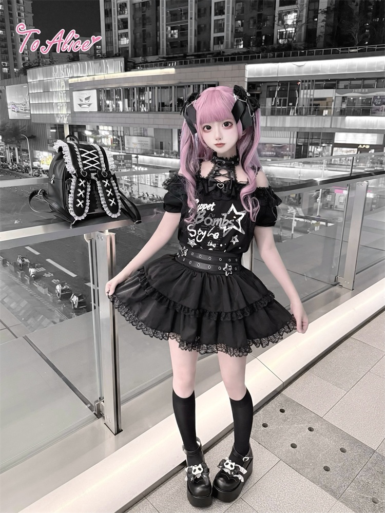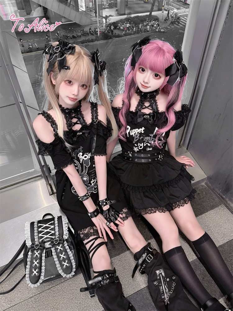 首元のレースアップとうさぎのプリントが映える、病み可愛い地雷系オフショルワンピース。