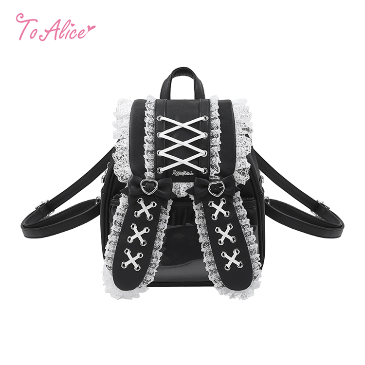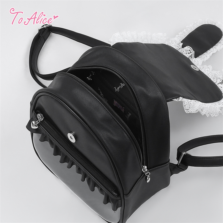 白いレースアップとフリルを重ねたうさ耳が愛らしいリュック。