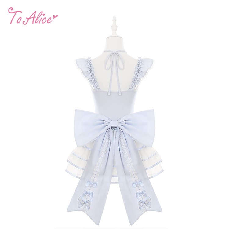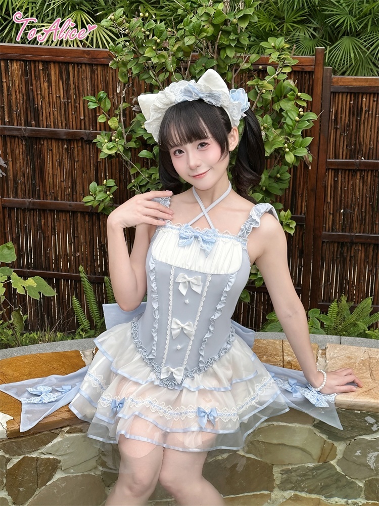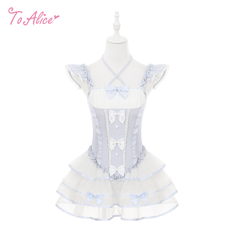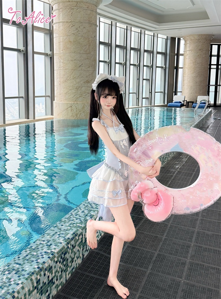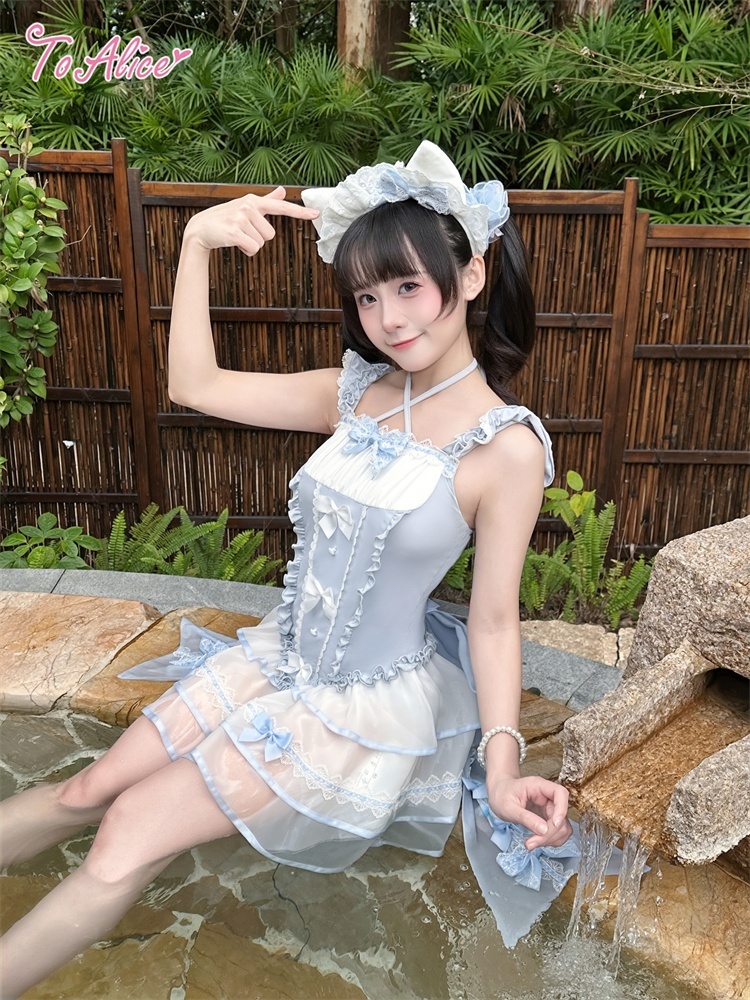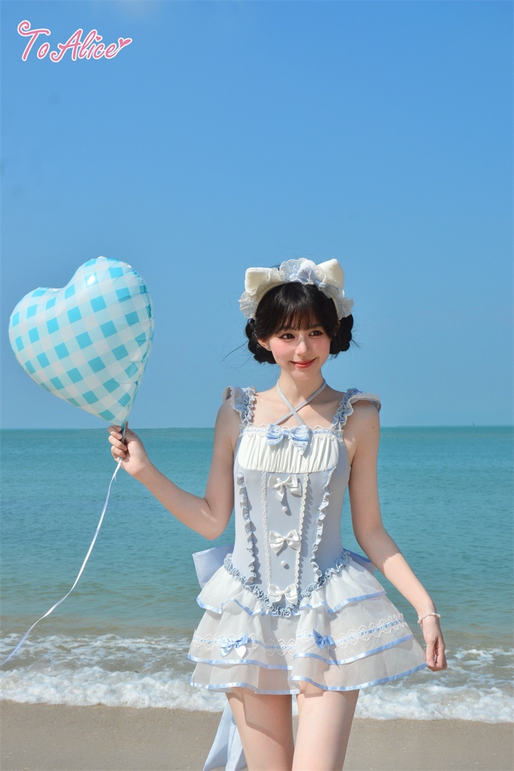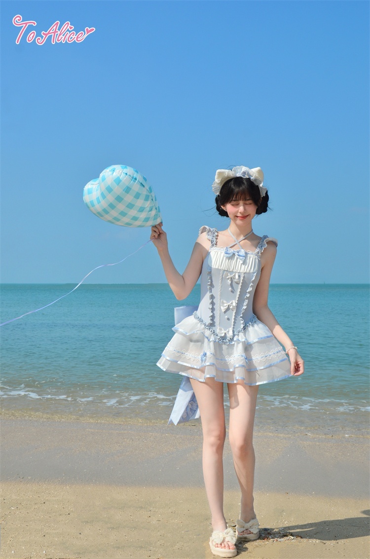 爽やかなサックスブルーとホワイト配色のウエストシルエットが綺麗なワンピース水着。