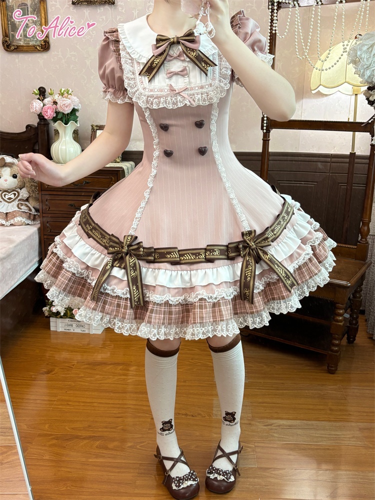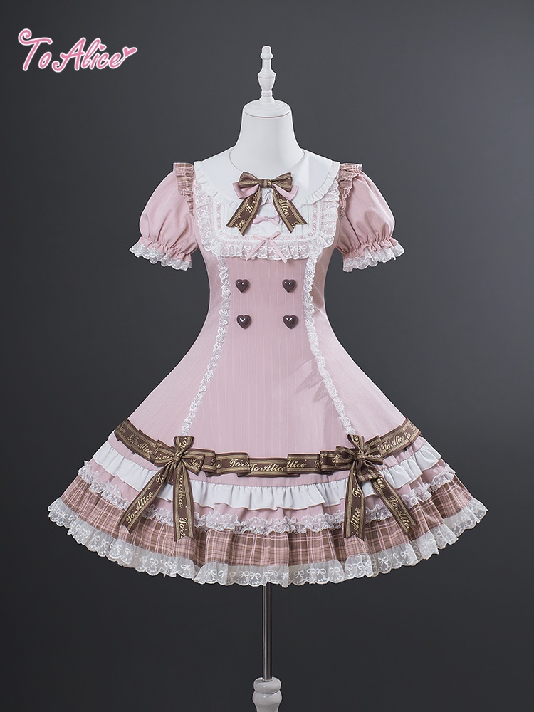 ピンクとブラウンの配色が可愛いショコラトリーなワンピース。