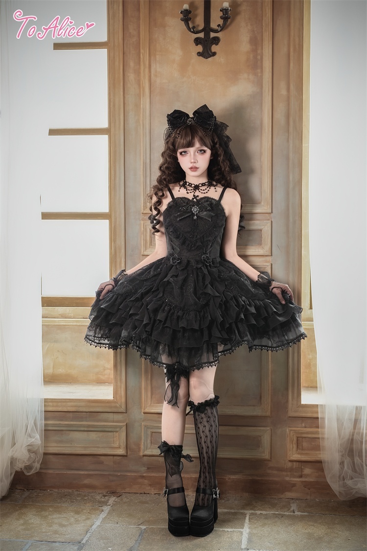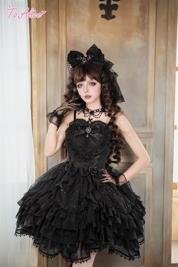 胸のハートデザインと薔薇がポイントのティアードドレス。