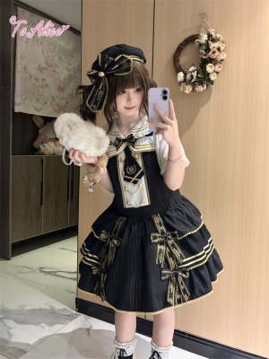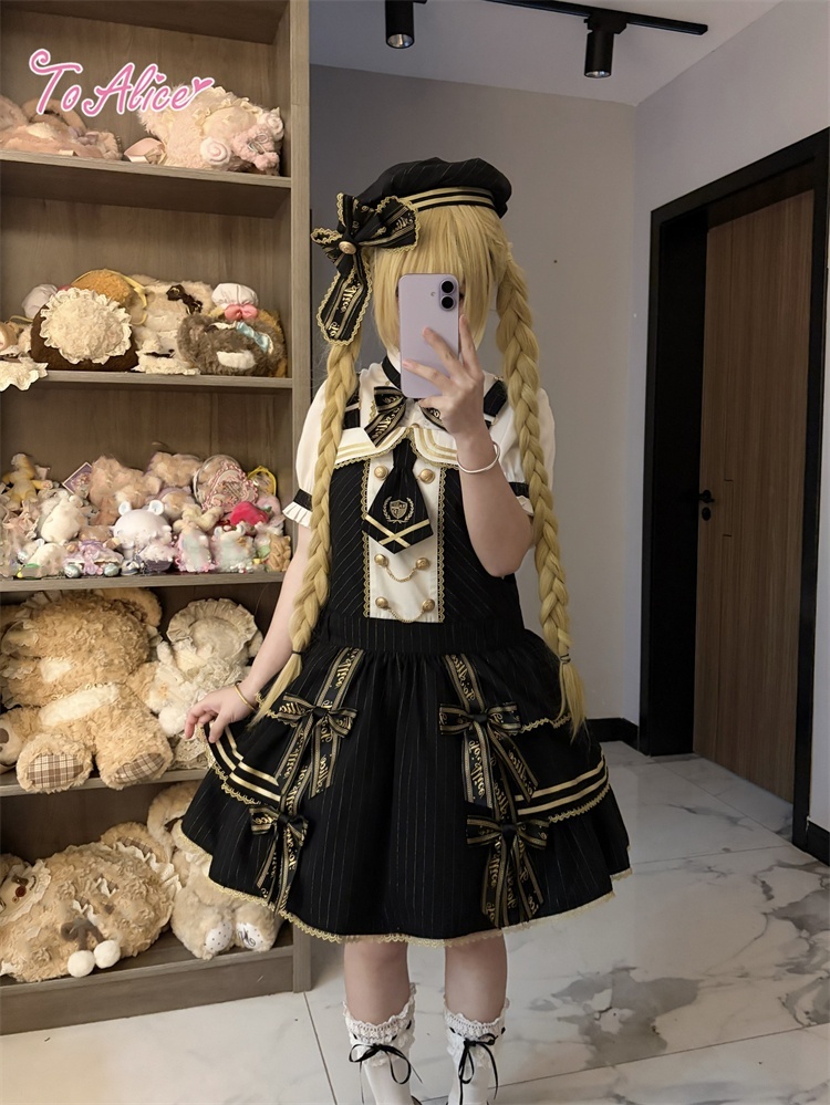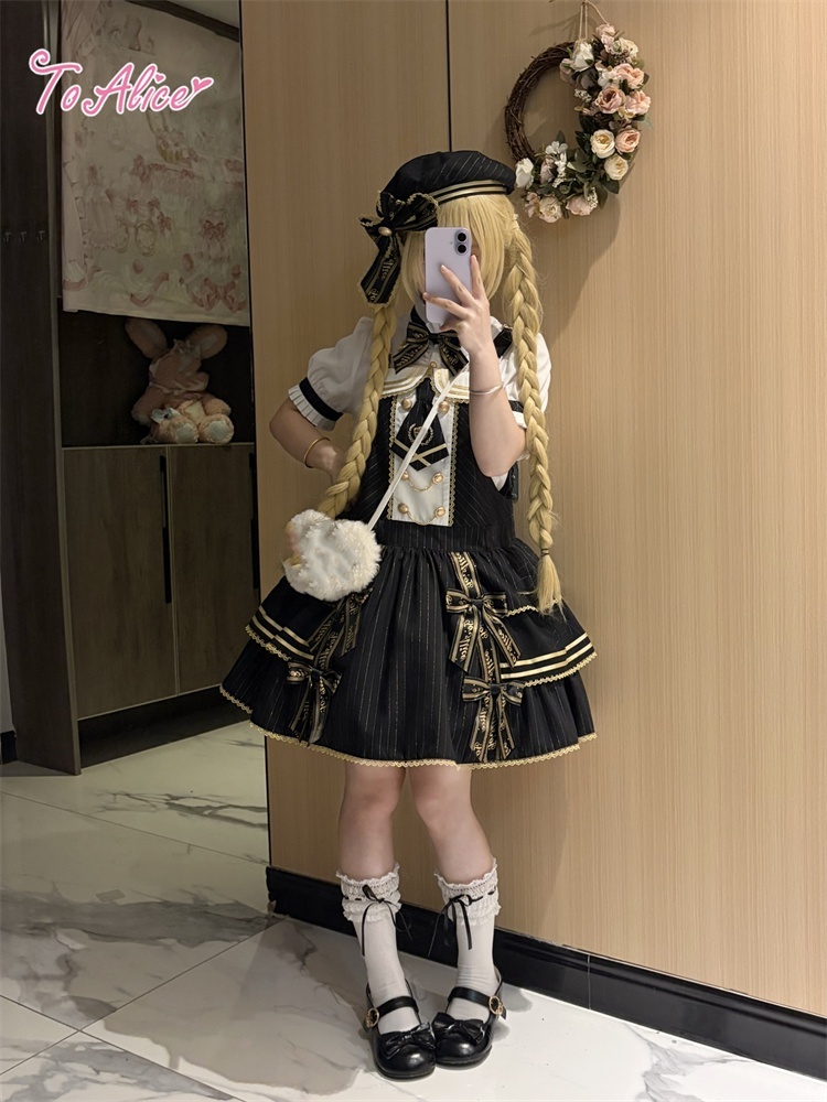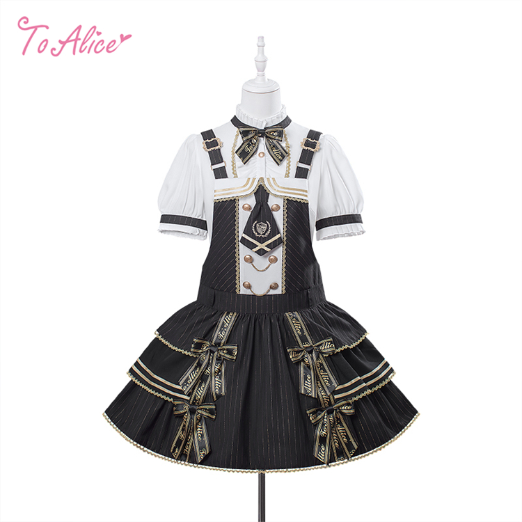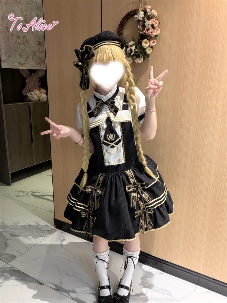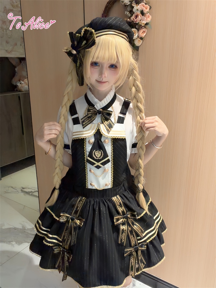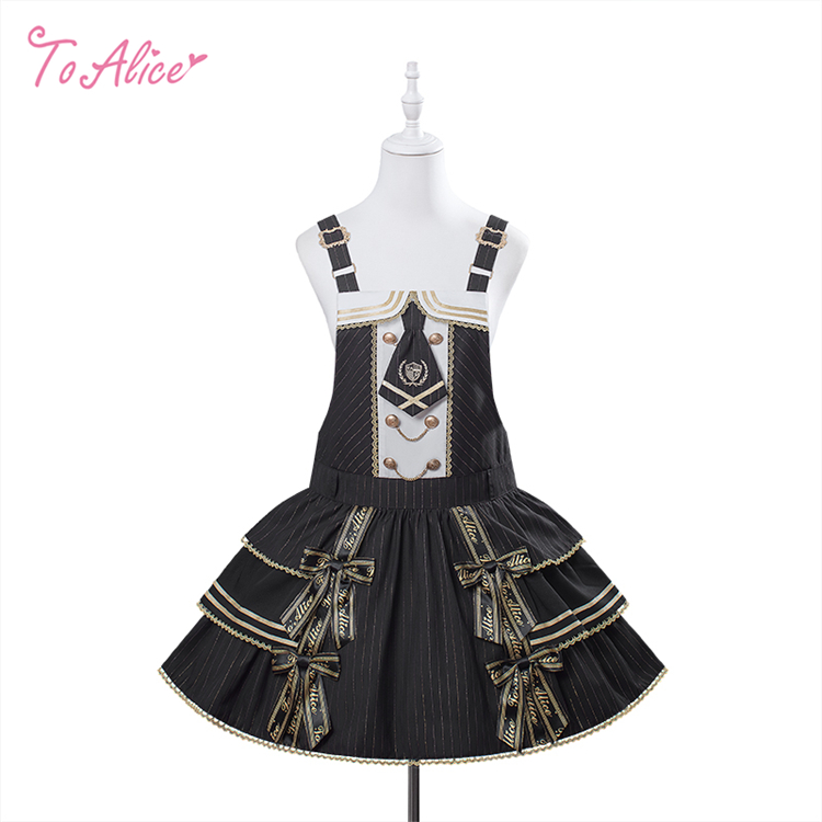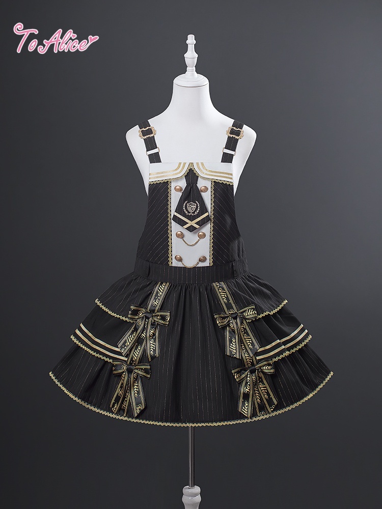 ロゴ入りリボンとサイドのティアードがポイントの学院風サロペットスカート。