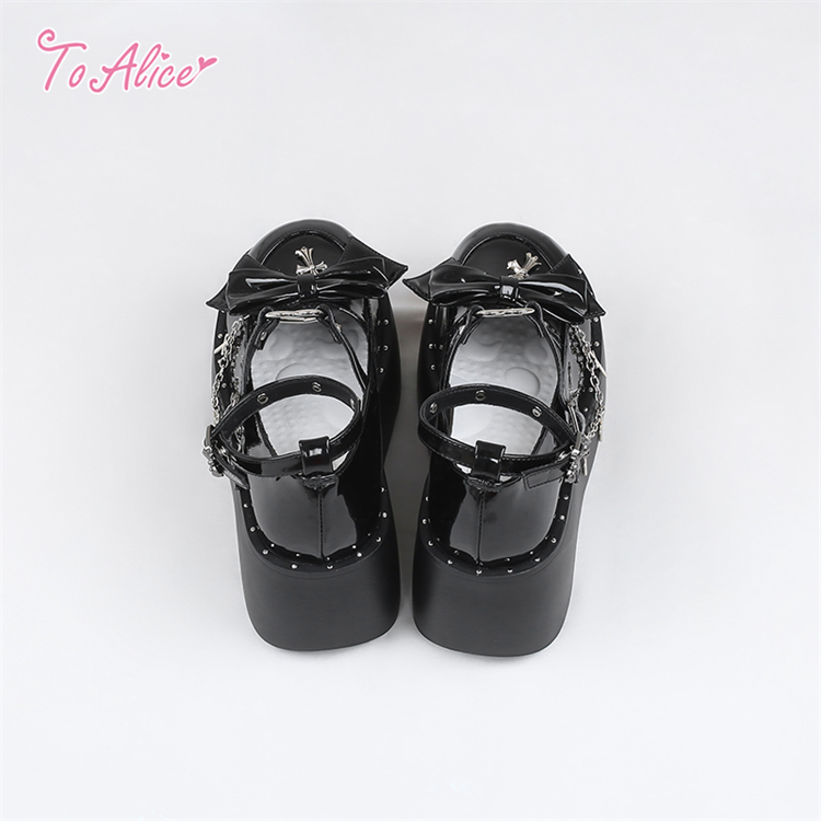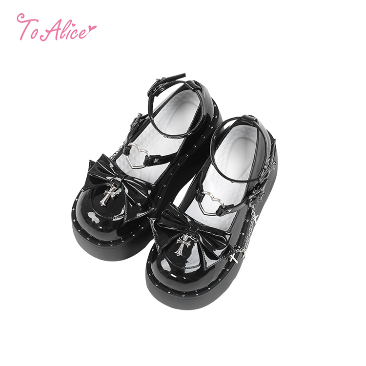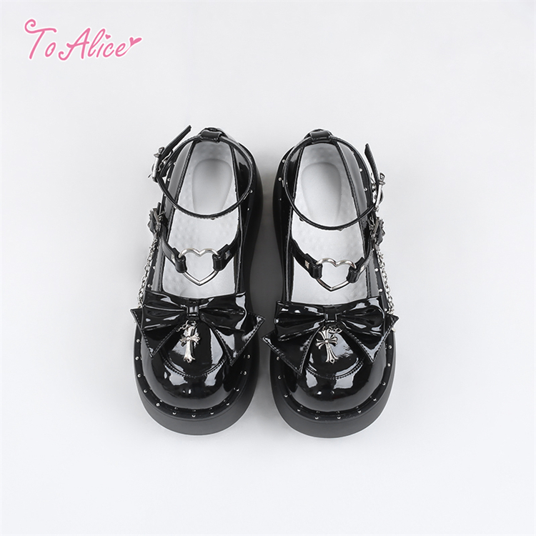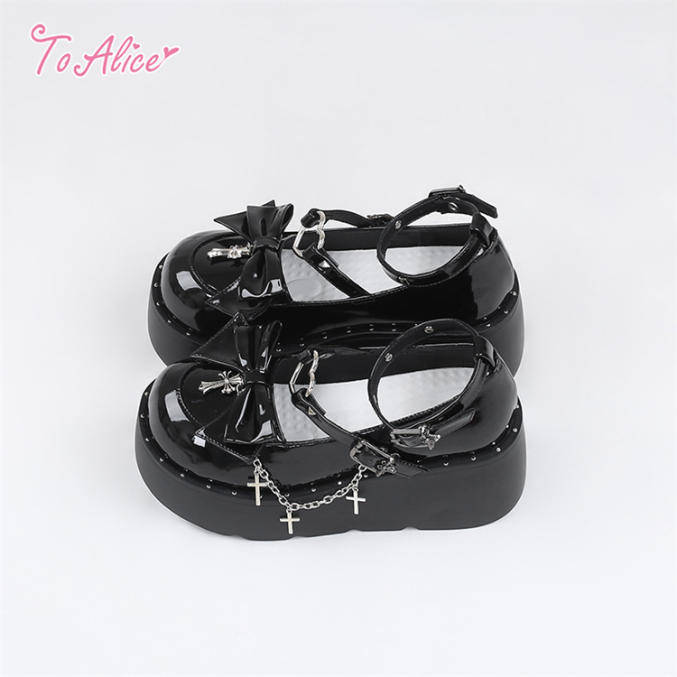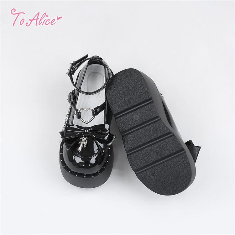 エナメル素材のリボン&クロスチャーム付きの厚底パンプス。