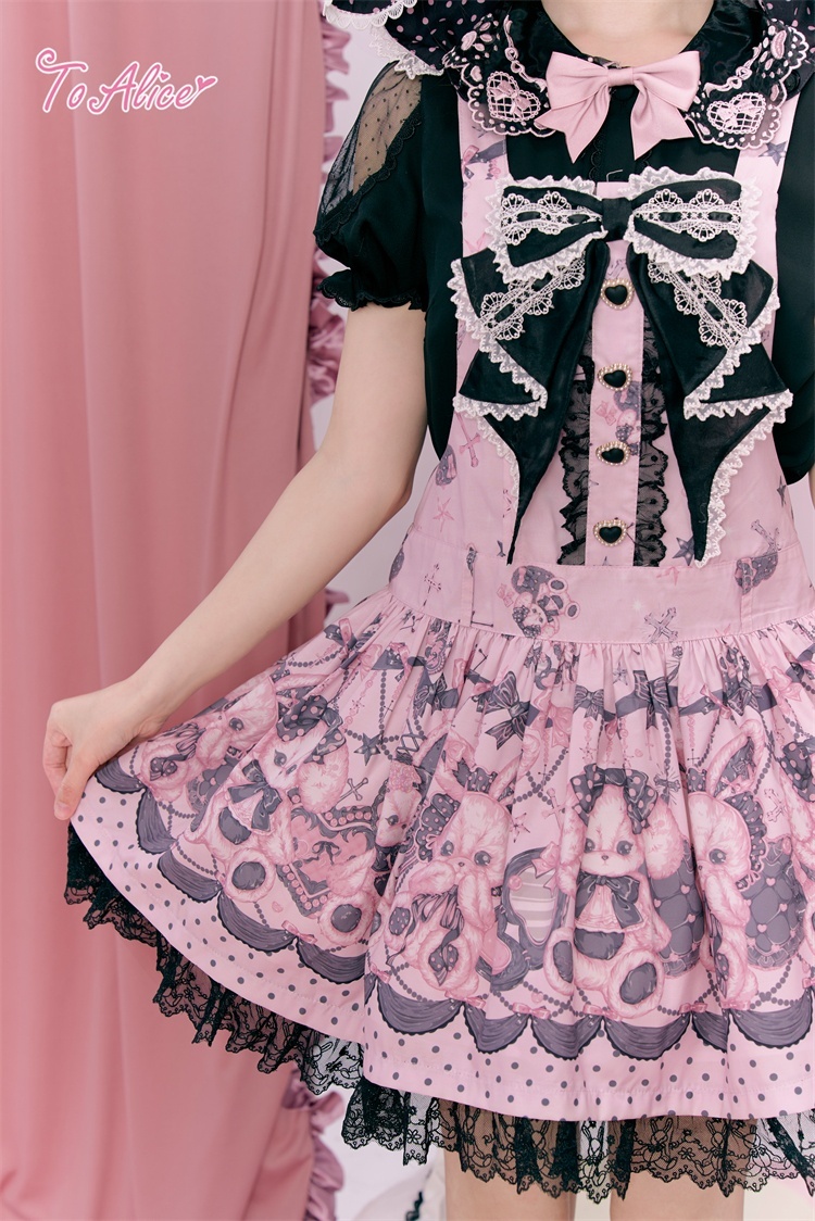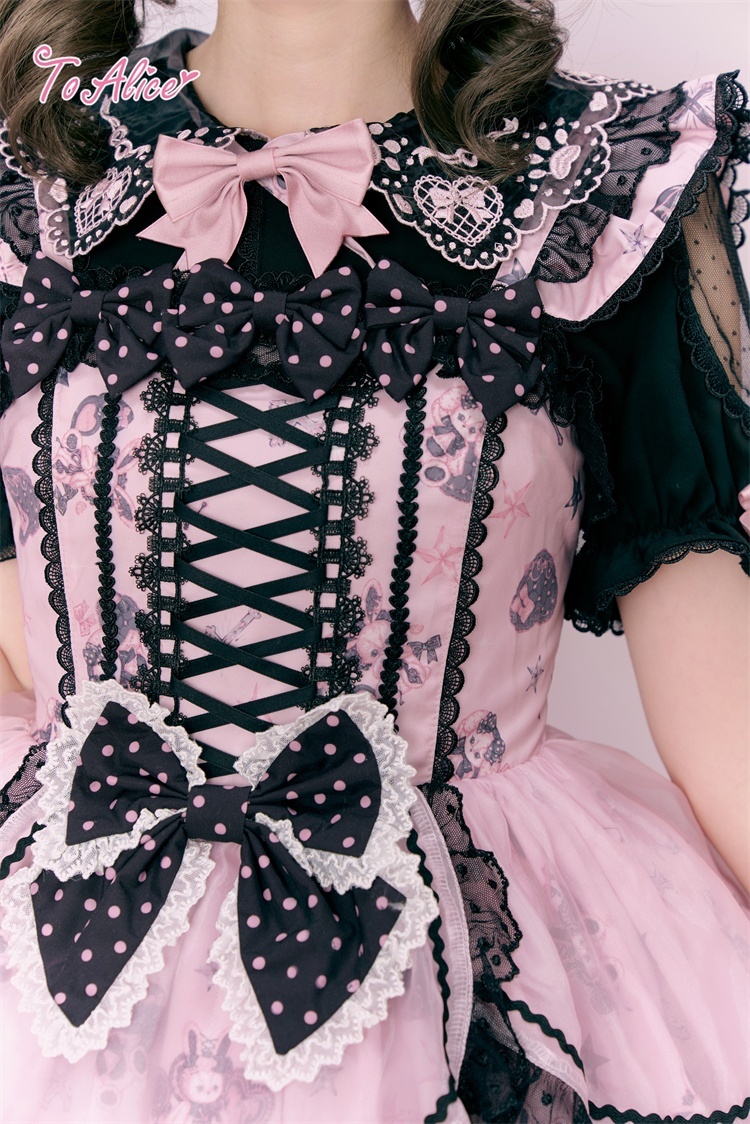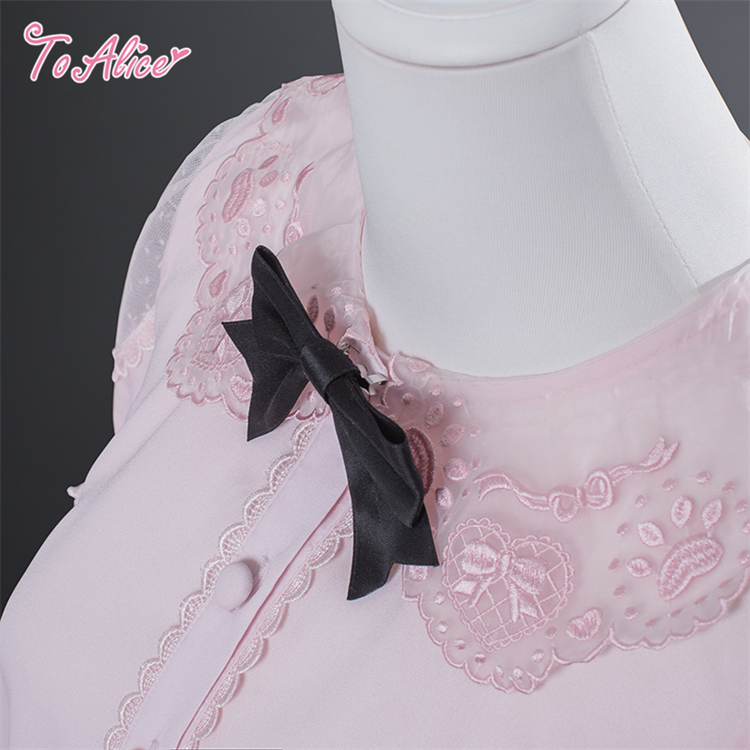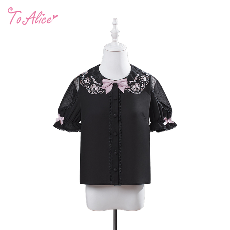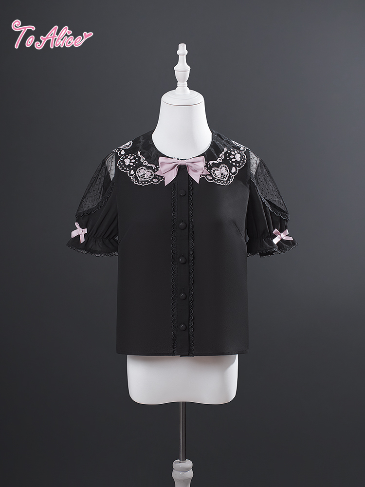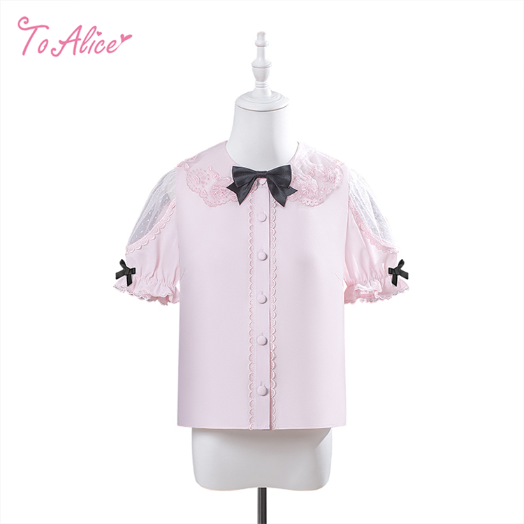 黒×ピンクの配色が可愛いレース切り替えパフ袖ブラウス。