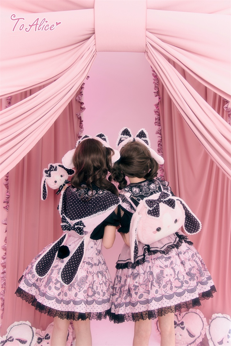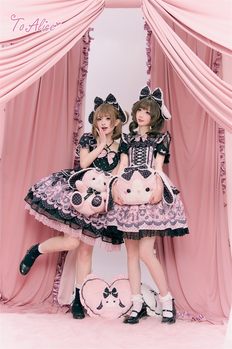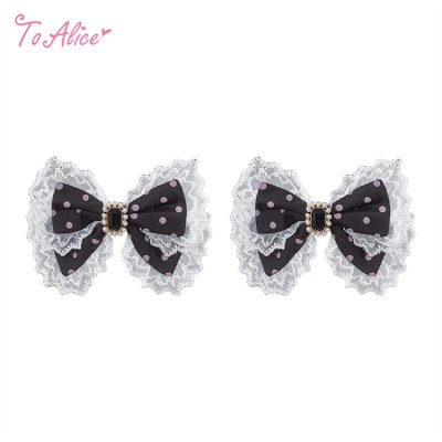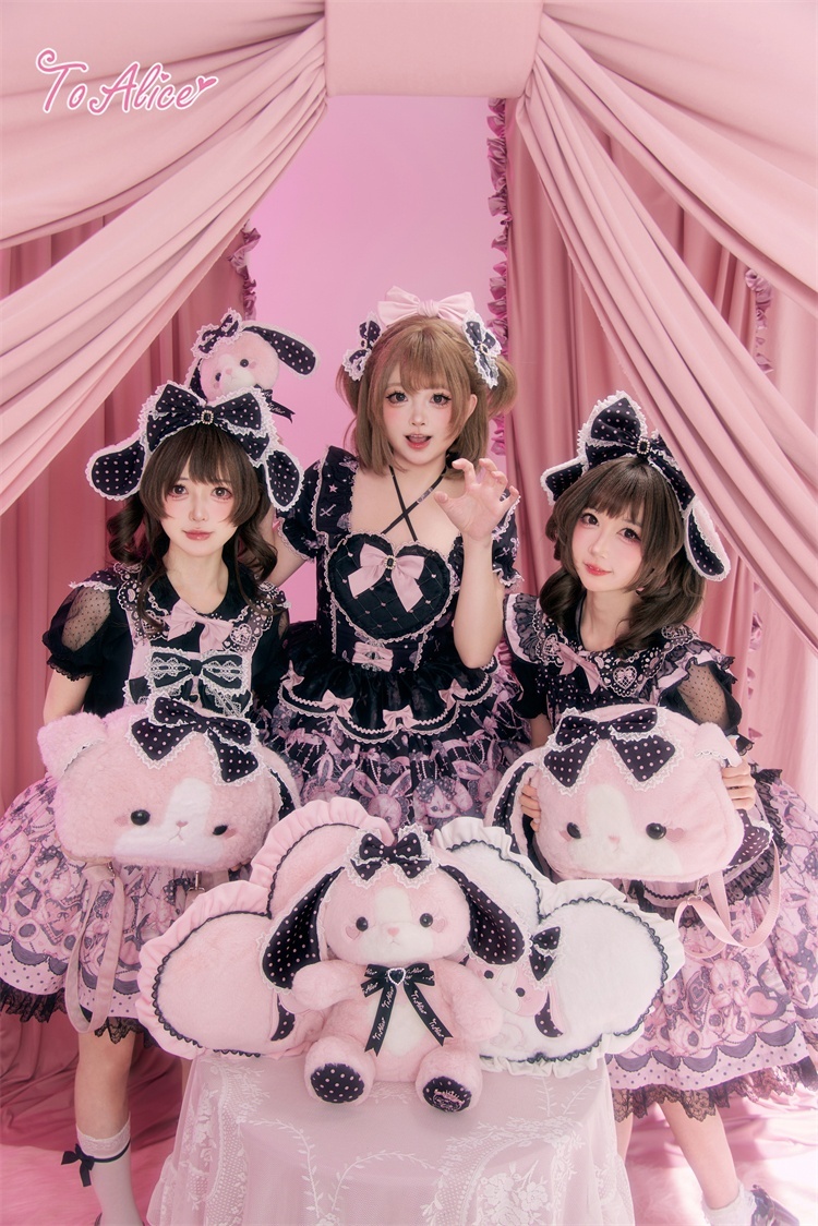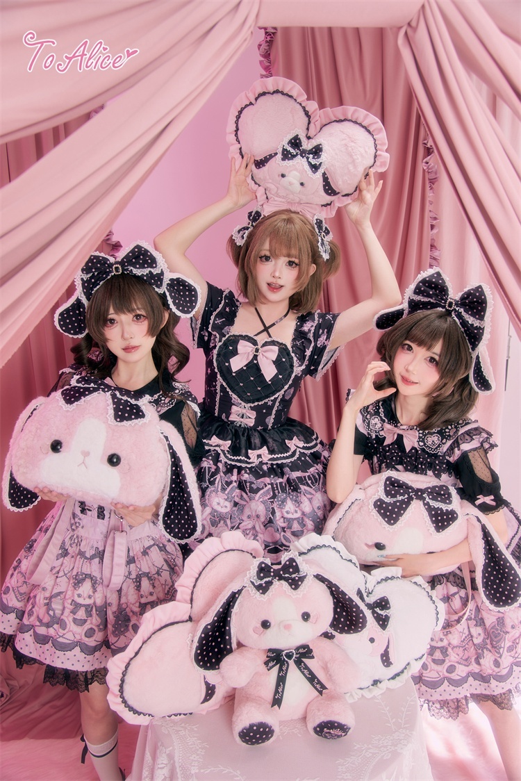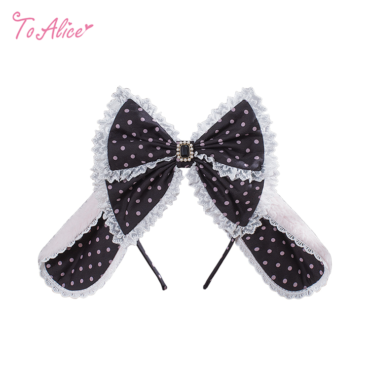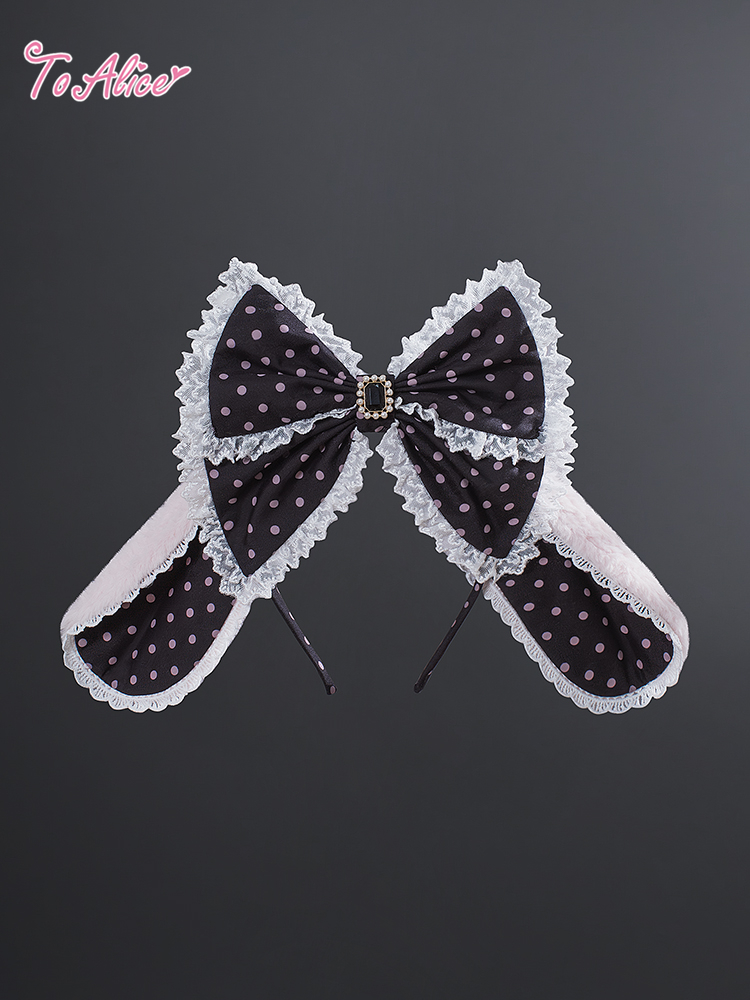 うさ耳付き黒×ピンクのドット柄リボンカチューシャ。