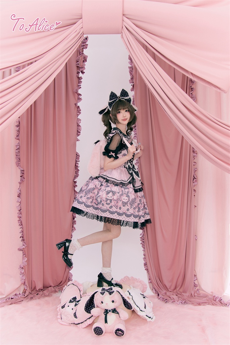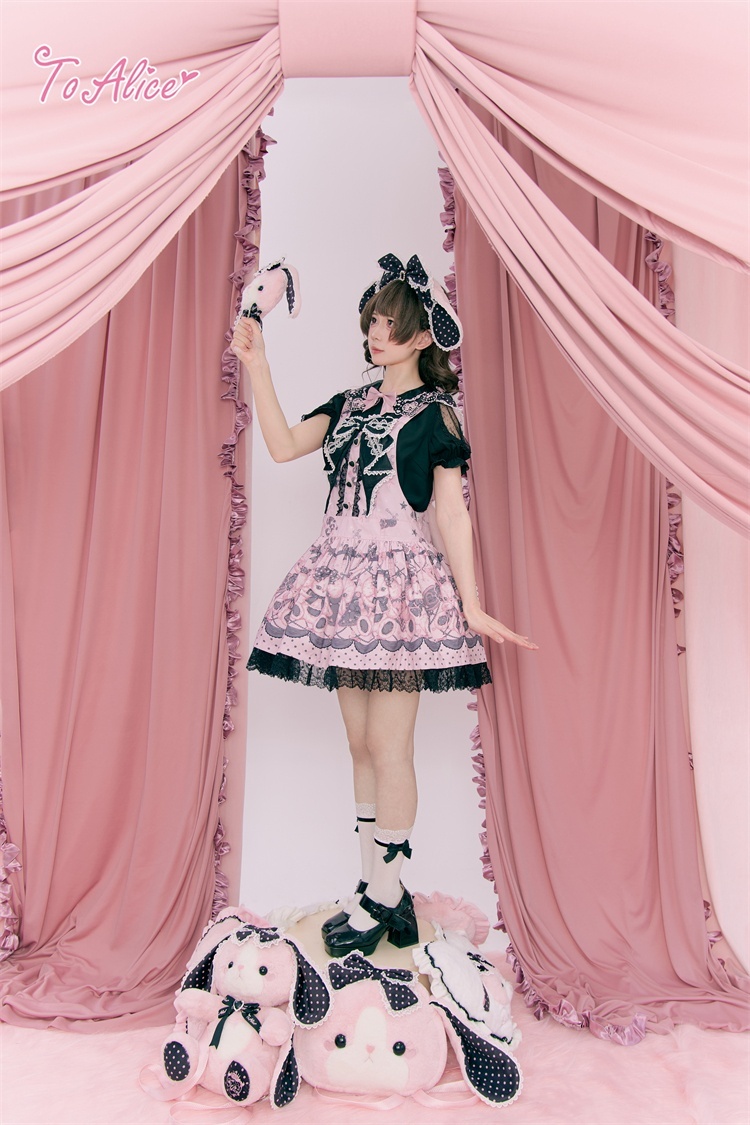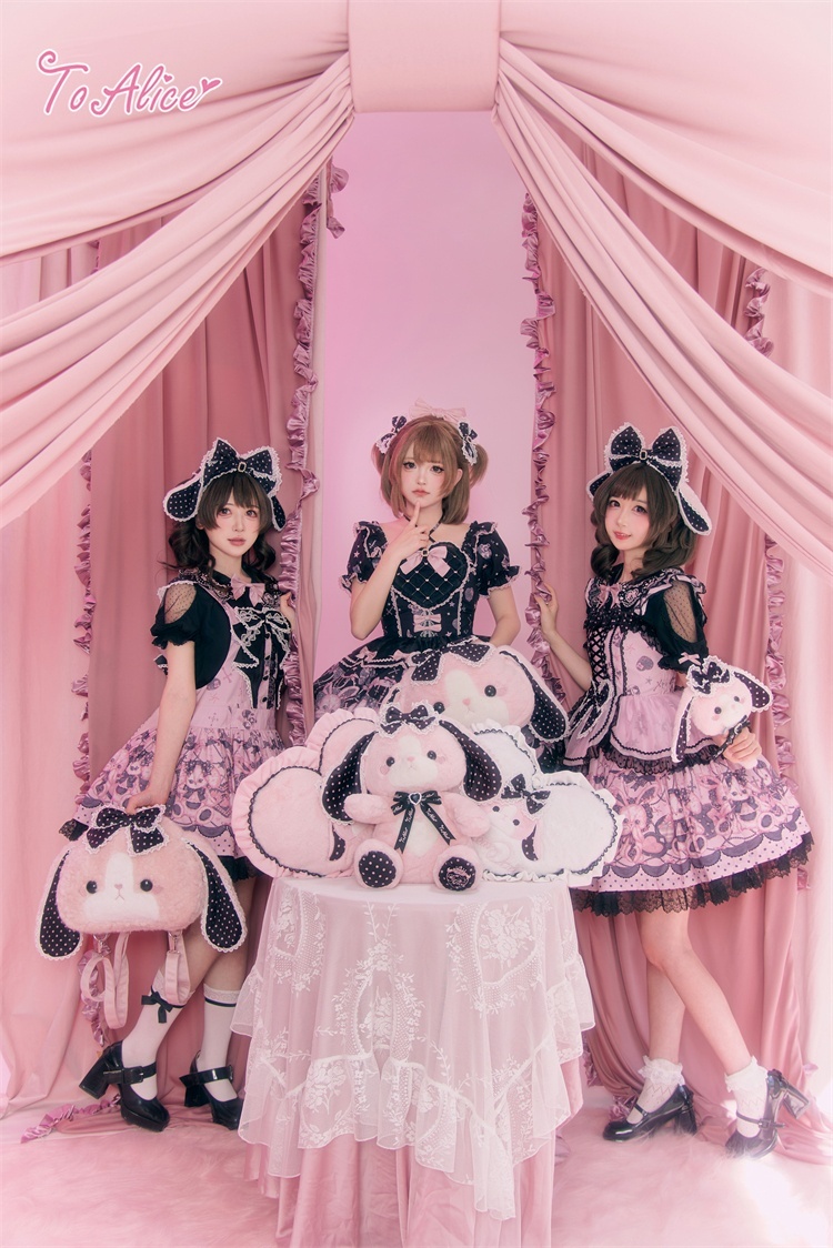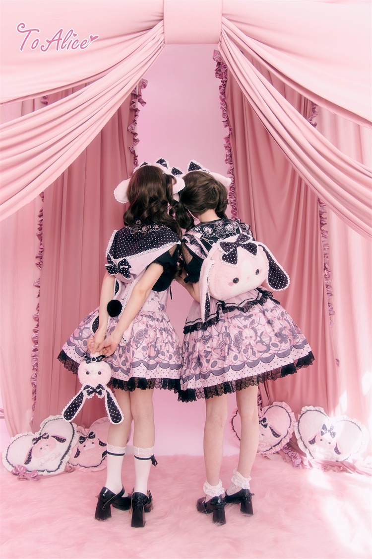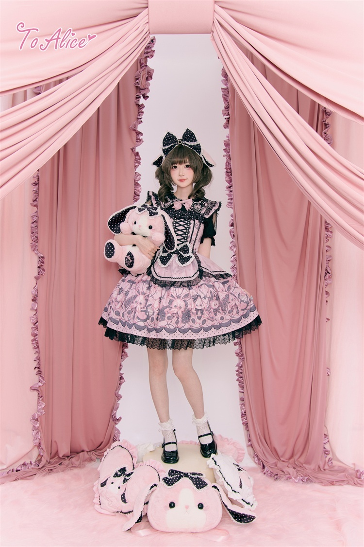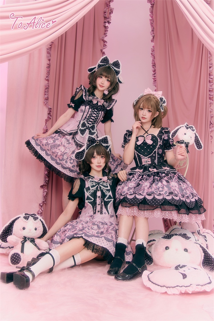 うさ耳付き黒×ピンクのドット柄リボンカチューシャ。